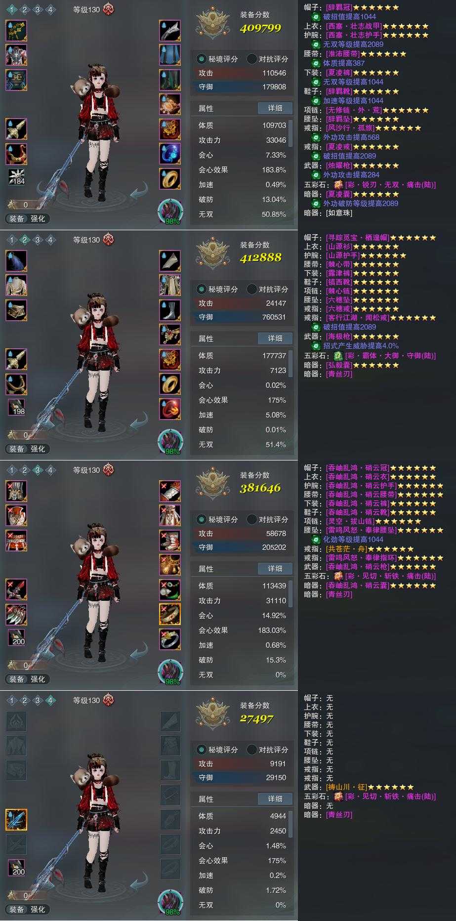 【装备】130级,天策装备一409799,铁牢律PVE412888,天策装备三381646,装备四27497
