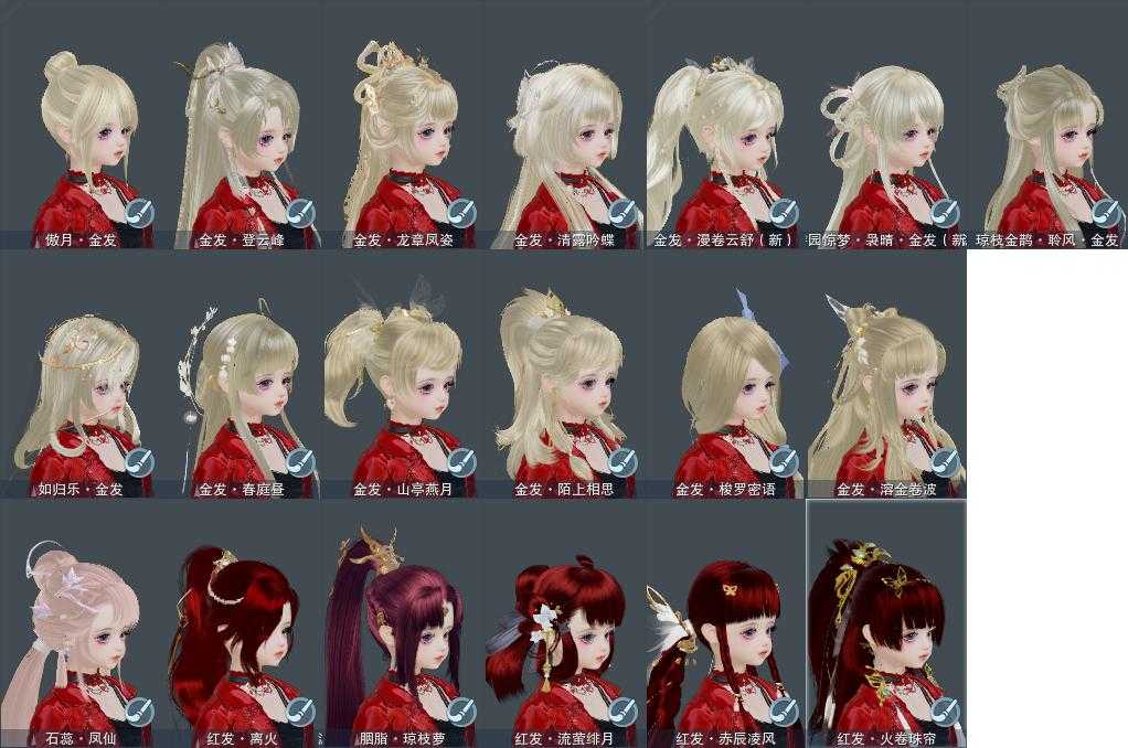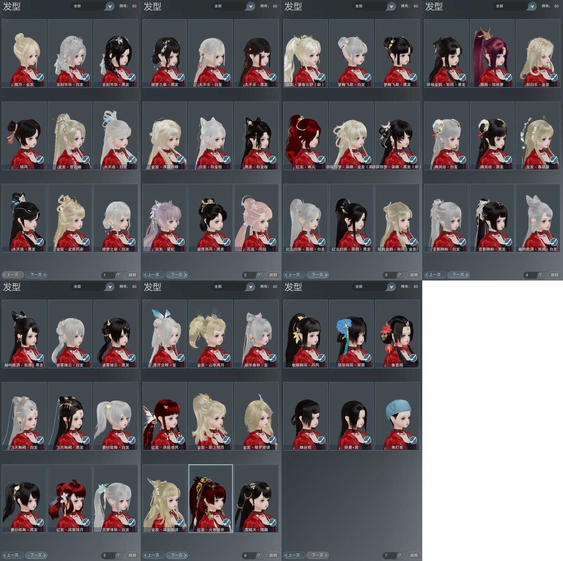 【发型】金发13个[资历金, 鼠金, 蝶金, 考金, 国金, 如归金, 新云金, 水母金, 龙金, 三代金, 傲月金发, 白琼枝金发, 粉游园金发], 红发6个[六红, 八红, 紫发, 凤仙粉, 小资历红, 大资历红], 黑发22个, 白发17个, 盒子发型[丝路黑, 二代七夕白, 踏云黑发, 飞天黑发, 四代中秋粉黑发, 小白龙黑发, 三代中秋白, 晴岚绘黑发, 雪月白发, 丝路白, 踏云白发, 飞天白发, 四代中秋粉白发, 小白龙白发, 晴岚绘白发, 白琼枝黑发, 白红尘黑发, 粉游园黑发, 白红尘白发, 小熊黑发, 小熊白发, 二代灰, 五代福袋黑发, 五代福袋白发, 婚纱盒黑发, 婚纱盒白发], 总页数7