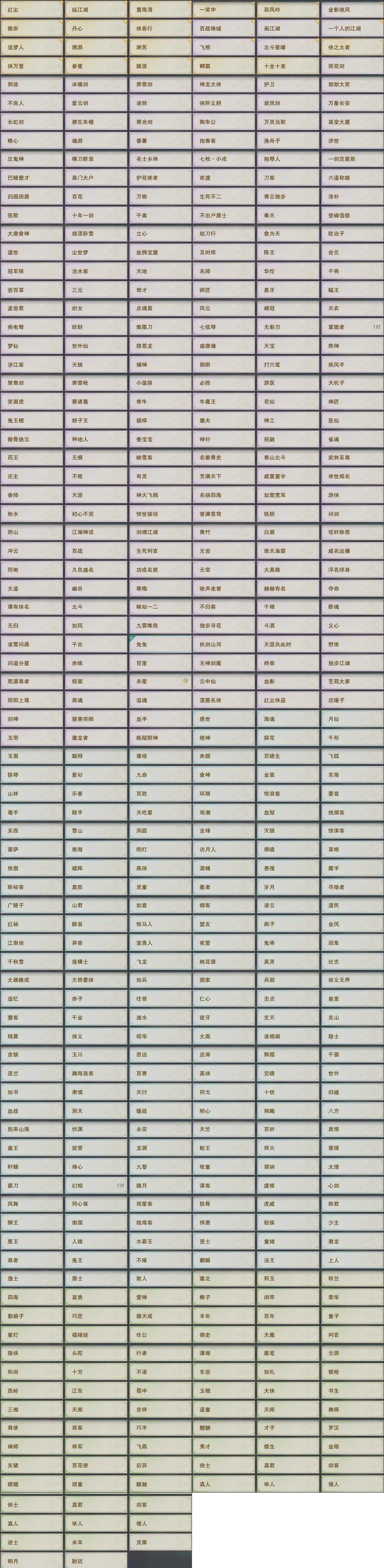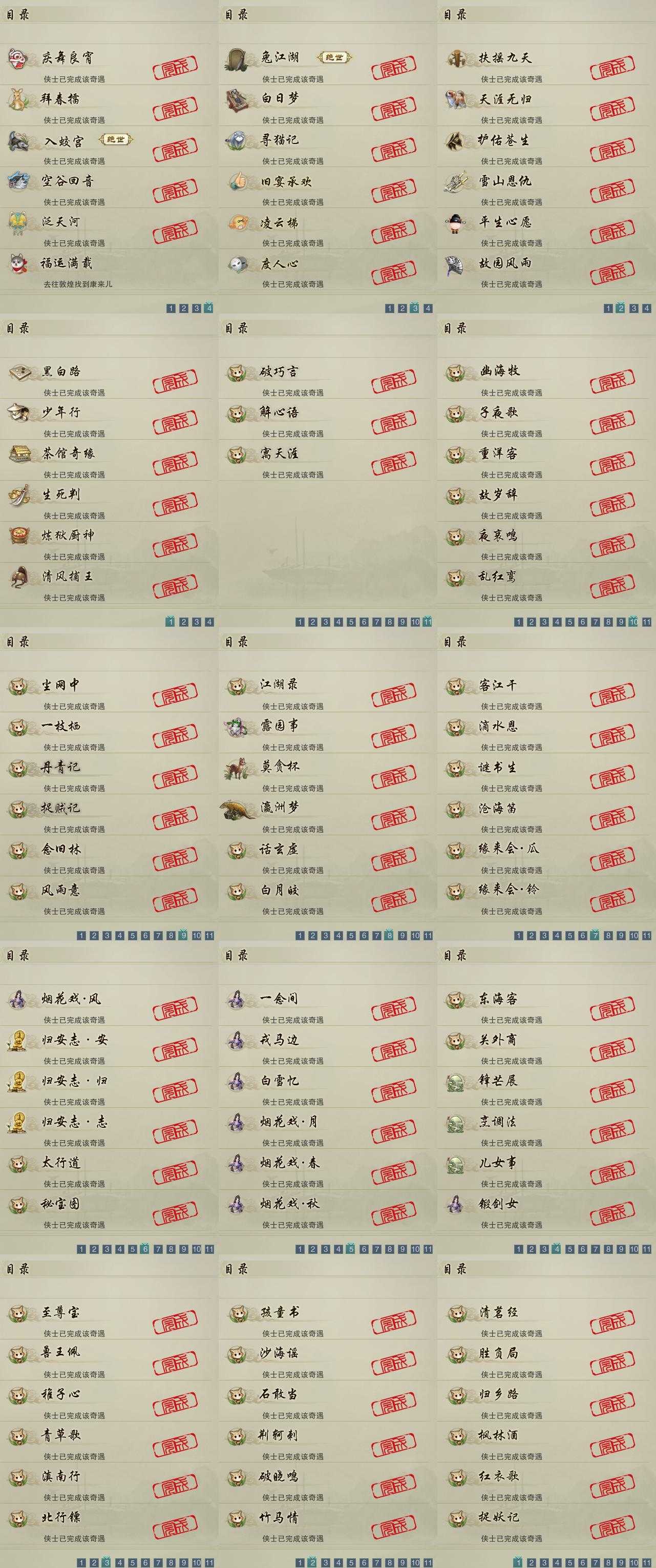 【奇遇】23个[白日梦, 天涯无归, 雪山恩仇, 兔江湖, 平生心愿, 黑白路, 护佑苍生, 少年行, 扶摇九天, 故园风雨, 清风捕王, 寻猫记, 茶馆奇缘, 庆舞良宵, 入蛟宫, 生死判, 凌云梯, 炼狱厨神, 度人心, 空谷回音, 旧宴承欢, 泛天河, 拜春擂]