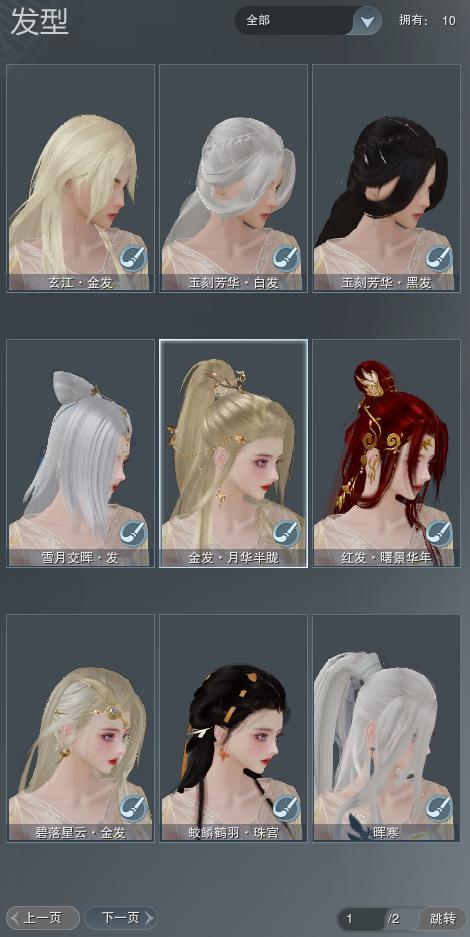 【发型】金发3个[鸡金, 苏金, 玄江金发], 红发1个[猴红], 黑发2个, 白发3个, 盒子发型[雪月白发], 总页数2