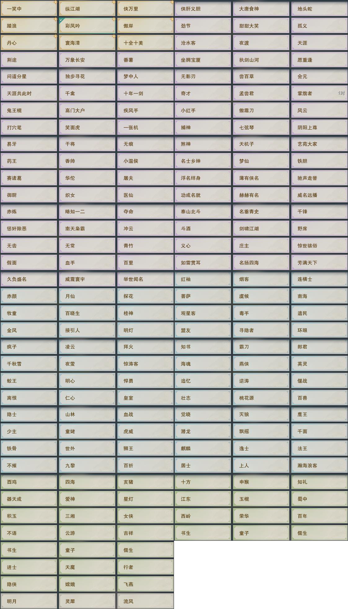【奇珍】68个[枫林酒, 红衣歌, 归乡路, 胜负局, 孩童书, 清茗经, 捉妖记, 至尊宝, 石敢当, 稚子心]
