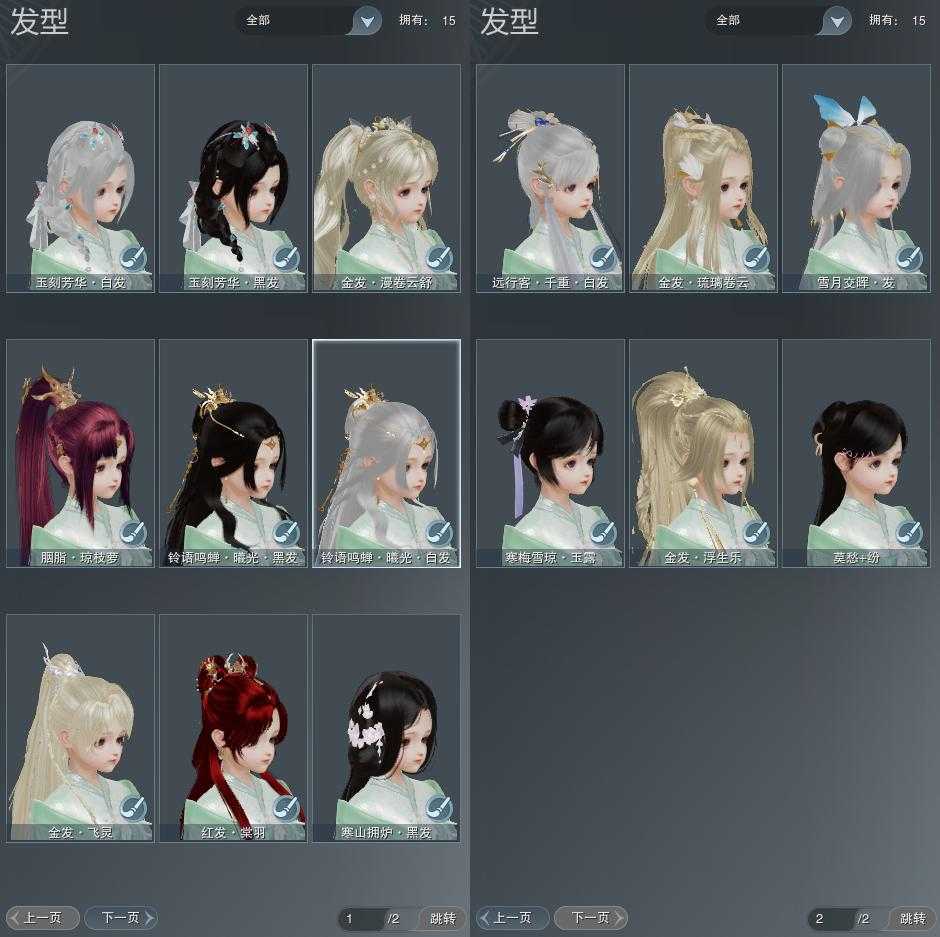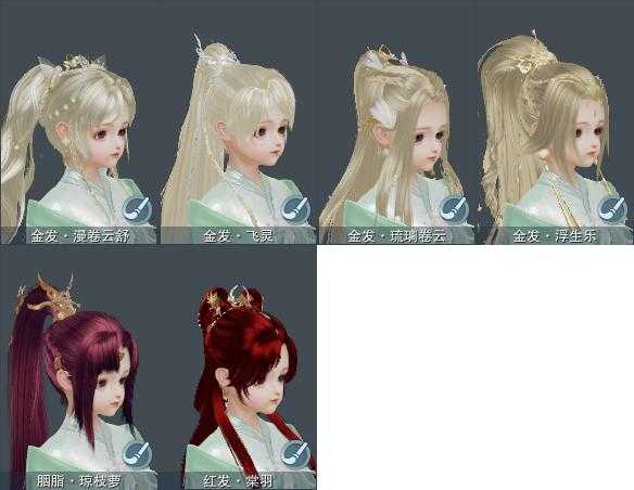 【发型】金发4个[喵金, 龙女金, 飒金, 云金], 红发2个[十红, 紫发], 黑发4个, 白发4个, 盒子发型[雪月白发, 白楼兰黑发, 蓝腿白, 白楼兰白发], 总页数2