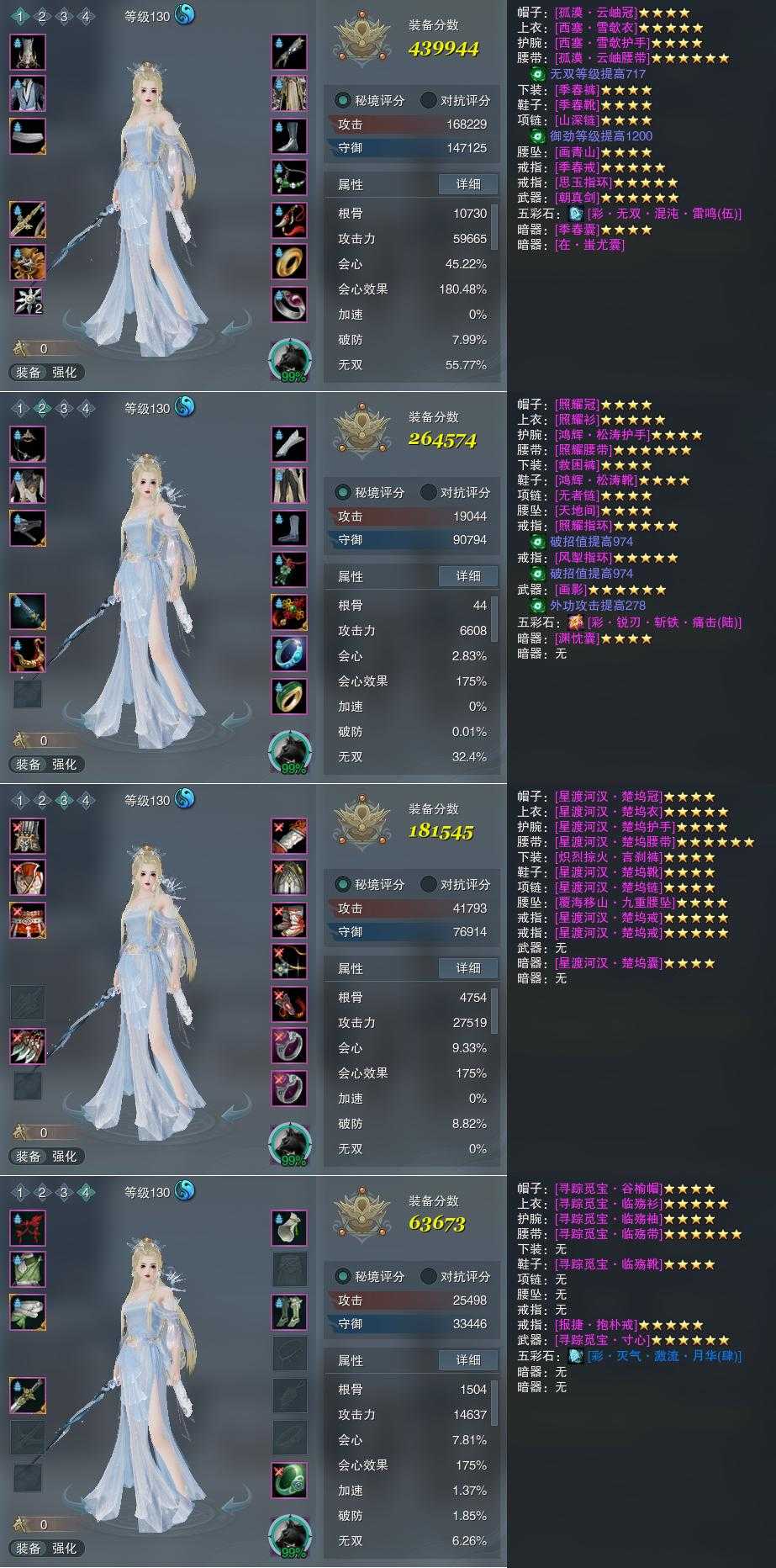 【装备】130级,紫霞功PVE439944,装备二264574,装备三181545,装备四63673