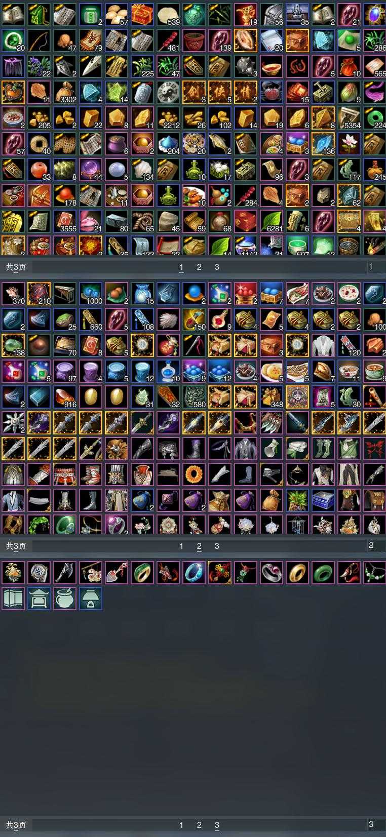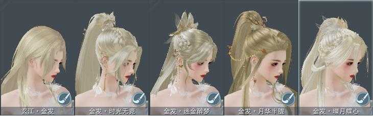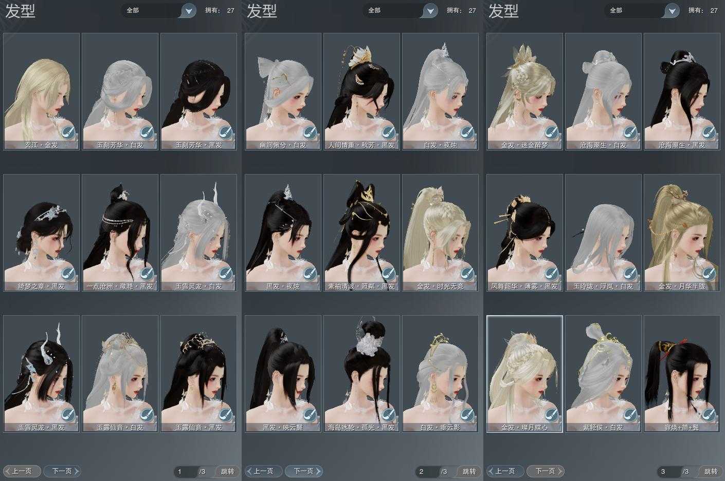 【发型】金发5个[狐金, 鸡金, 时光金, 牛金, 玄江金发], 红发0个[], 黑发12个, 白发9个, 盒子发型[薄雾黑发, 浮岚白发, 沧海黑发, 沧海白发, 白海岛黑发, 哒白, 蓝水袖黑发, 二代哒黑, 二代哒白, 黄人间黑发, 山海黑发, 山海白发, 幽涧愀兮白发, 灵龙盒黑发, 蓝沧洲盒黑发, 灵龙白发, 婚纱盒黑发], 总页数3