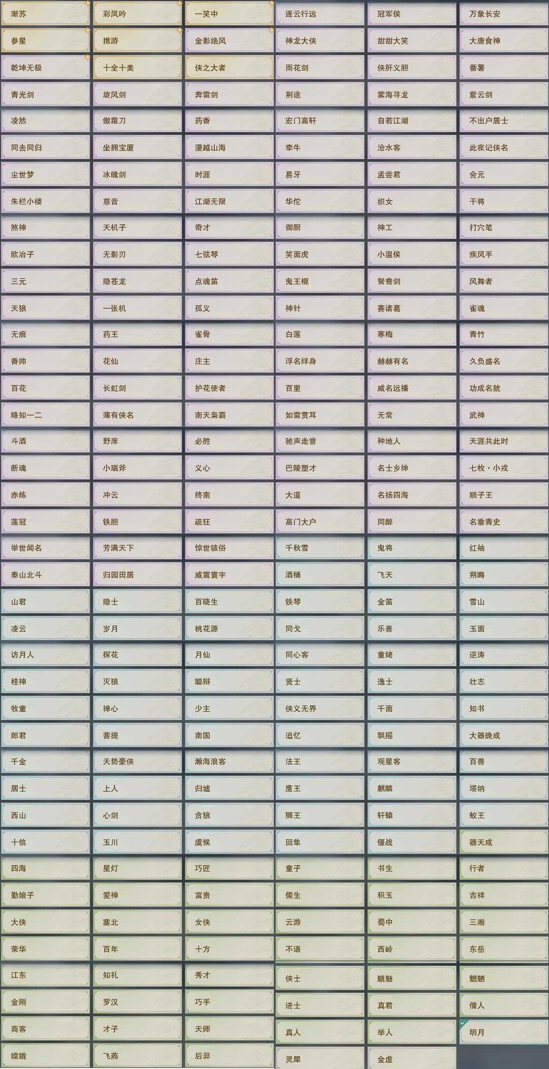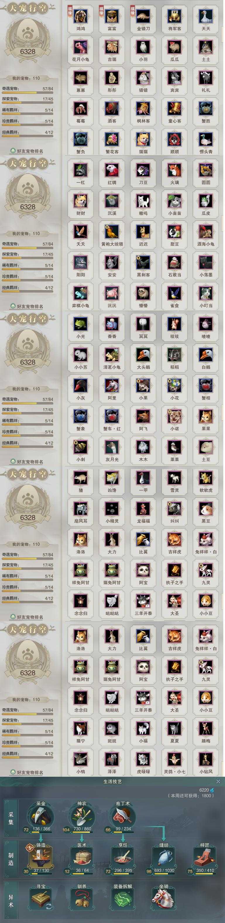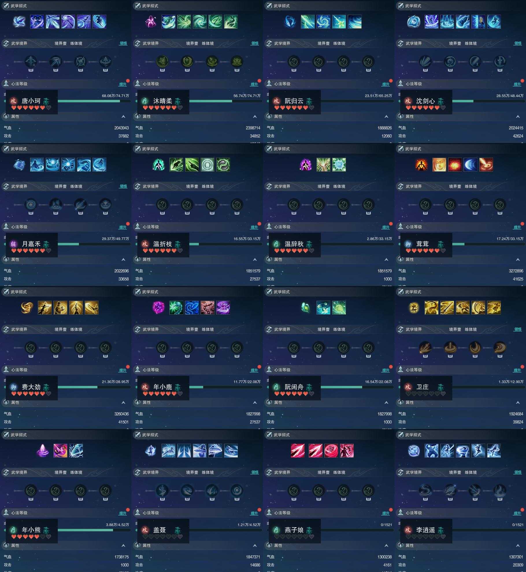【同伴】唐小珂82级境界壹,沐晴柔82级境界壹,阮归云81级境界壹,沈剑心80级境界壹,月嘉禾79级境界壹,温折枝76级境界壹,温辞秋76级境界壹,茸茸76级境界壹,费大劲75级境界壹,年小鹿73级境界壹,阮闲舟73级境界壹,卫庄69级境界壹,年小熊61级境界壹,盖聂61级境界壹,燕子娘1级境界壹,李逍遥1级境界壹
