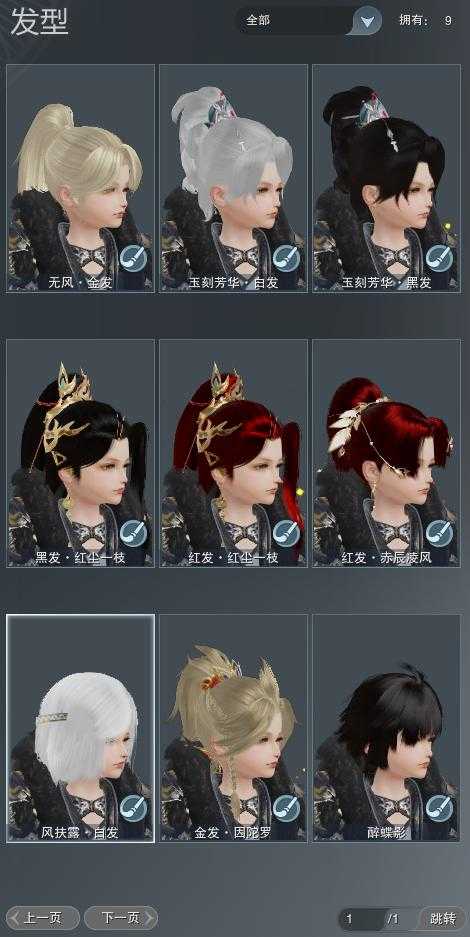 【发型】金发3个[猴金, 考金, 无风金发], 红发2个[八红, 十二红], 黑发3个, 白发2个, 盒子发型[十二黑], 总页数1