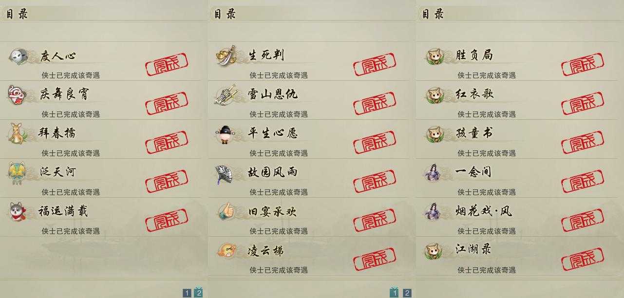 【奇遇】11个[雪山恩仇, 平生心愿, 故园风雨, 庆舞良宵, 生死判, 凌云梯, 度人心, 旧宴承欢, 泛天河, 拜春擂, 福运满载]