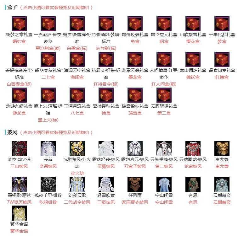 【披风】17个,[蚩尤蓑, 7W资历披风, 三山披风, 奇遇披风, 刀盒子披风, 策二披风, 龙盒披风, 业火劫, 灵狐披风, 二代战令披风, 三豪披风, 空山闲雪, 云麒赫奕, 繁华金语]