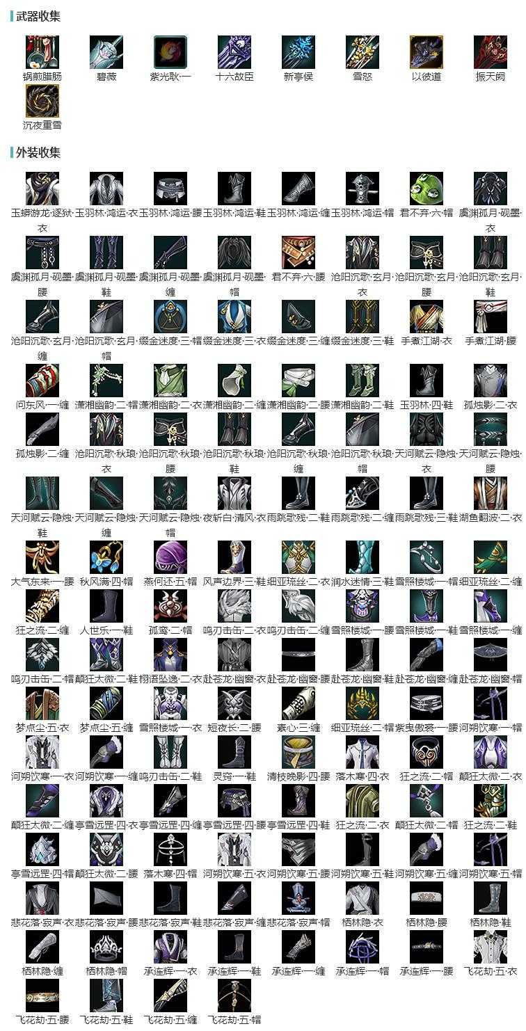 【拓印】9武器, 124成衣收集,80CW雪怒,95CW新亭侯,110CW以彼道,120CW沉夜重雪