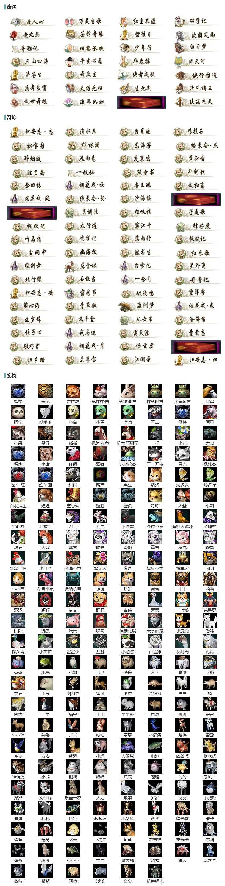 【奇遇】26个[三山四海, 天涯无归, 白日梦, 劝学记, 平生心愿, 惜往日, 乱世舞姬, 济苍生, 少年行, 扶摇九天, 故园风雨, 流年如虹, 清风捕王, 舞众生, 侠行囧途, 茶馆奇缘, 寻猫记, 万灵当歌, 生死判, 庆舞良宵, 度人心, 赴九幽, 旧宴承欢, 红尘不渡, 侠者成歌, 拜春擂]