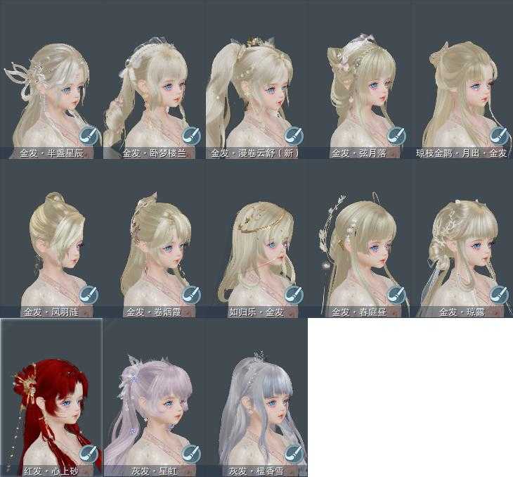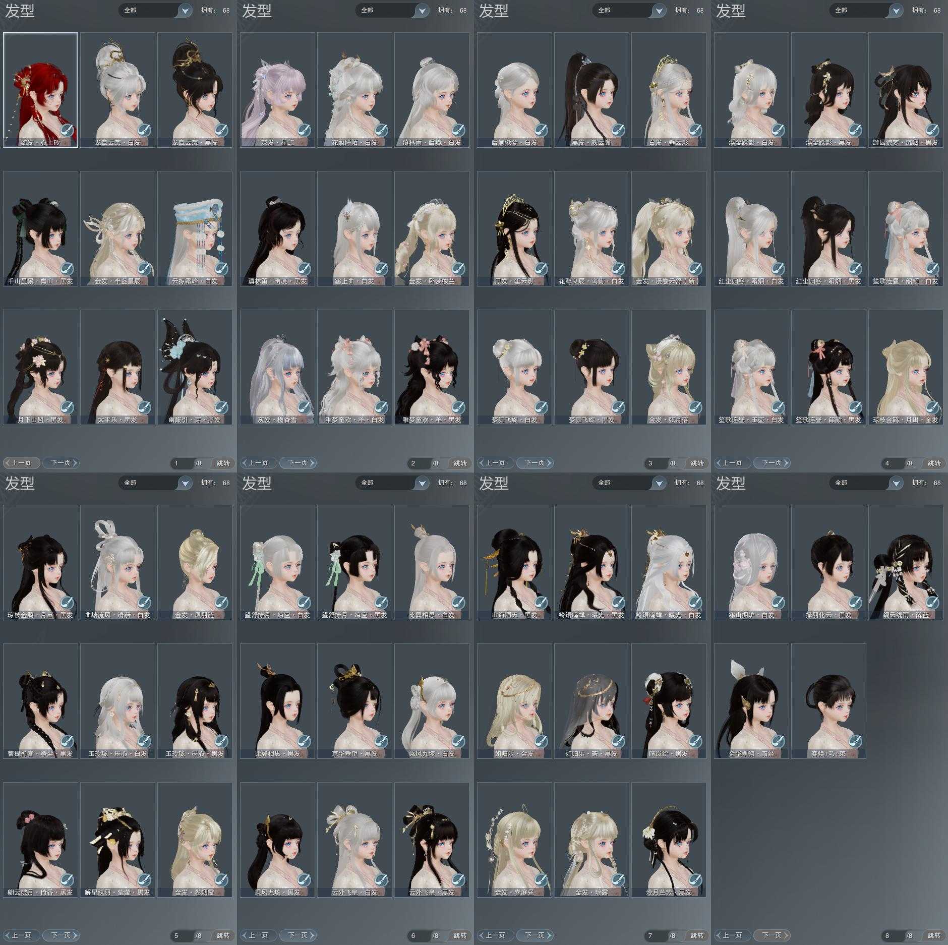 【发型】金发10个[鼠金, 珊瑚金, 如归金, 角金, 凤金, 巴卡金, 新云金, 女仆金, 精灵金, 澄琼枝金发], 红发3个[蛇红, 二代灰, 一代灰], 黑发32个, 白发22个, 盒子发型[泠月黑发, 晴岚绘黑发, 棉袄白, 白楼兰黑发, 白如归黑发, 飞皇黑发, 二代乘风黑发, 五代七夕黑发, 绿中秋黑发, 黄重阳黑发, 粉同人黑发, 白楼兰白发, 墨心黑发, 净尘黑发, 飞皇白发, 二代乘风白发, 五代七夕白发, 绿中秋白发, 澄琼枝黑发, 墨心白发, 唐风韶颜黑发, 白红尘黑发, 绿游园黑发, 蓝曲塘白, 小金龙黑发, 唐风玉壶白发, 唐风韶颜白发, 白红尘白发, 小熊黑发, 小金龙白发, 哒黑, 小熊白发, 白六七白发, 哒白, 羊盒黑发, 羊盒白发, 三代福袋白发, 幽涧愀兮白发, 黑傣族黑发, 黑傣族白发, 踏青白发, 蓝幽馥黑发, 九七黑发, 绿千山黑发, 墨龙盒黑发, 云掠霜峰白发, 墨龙盒白发], 总页数8