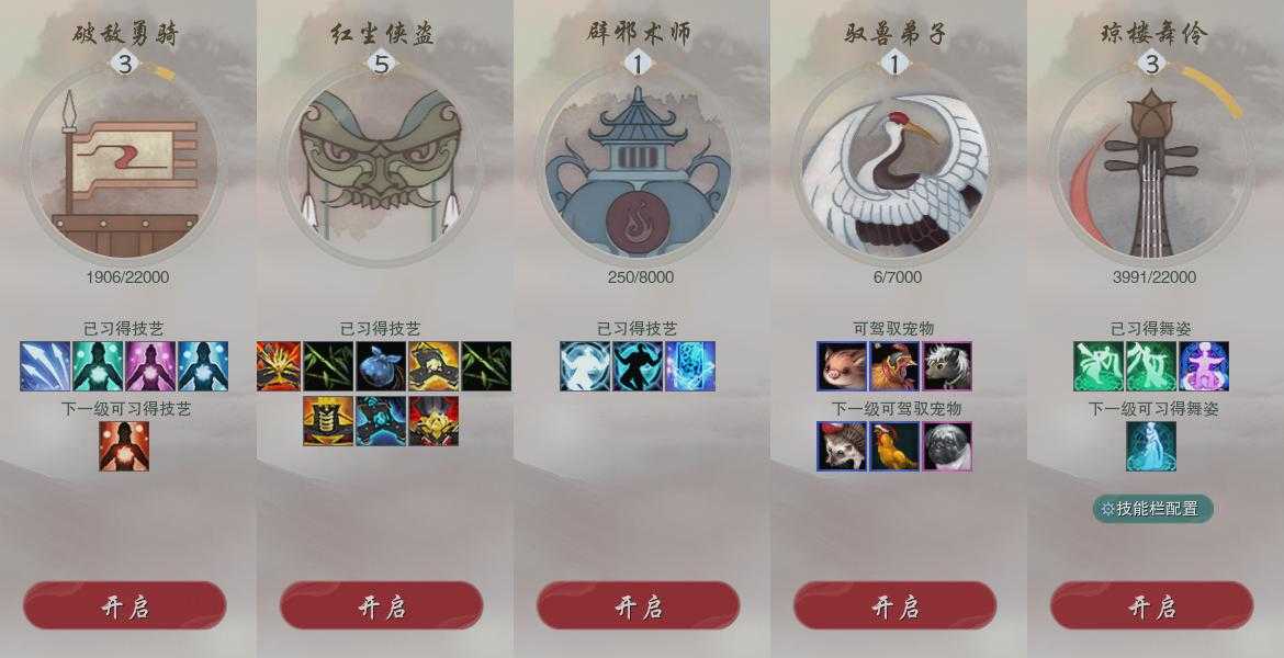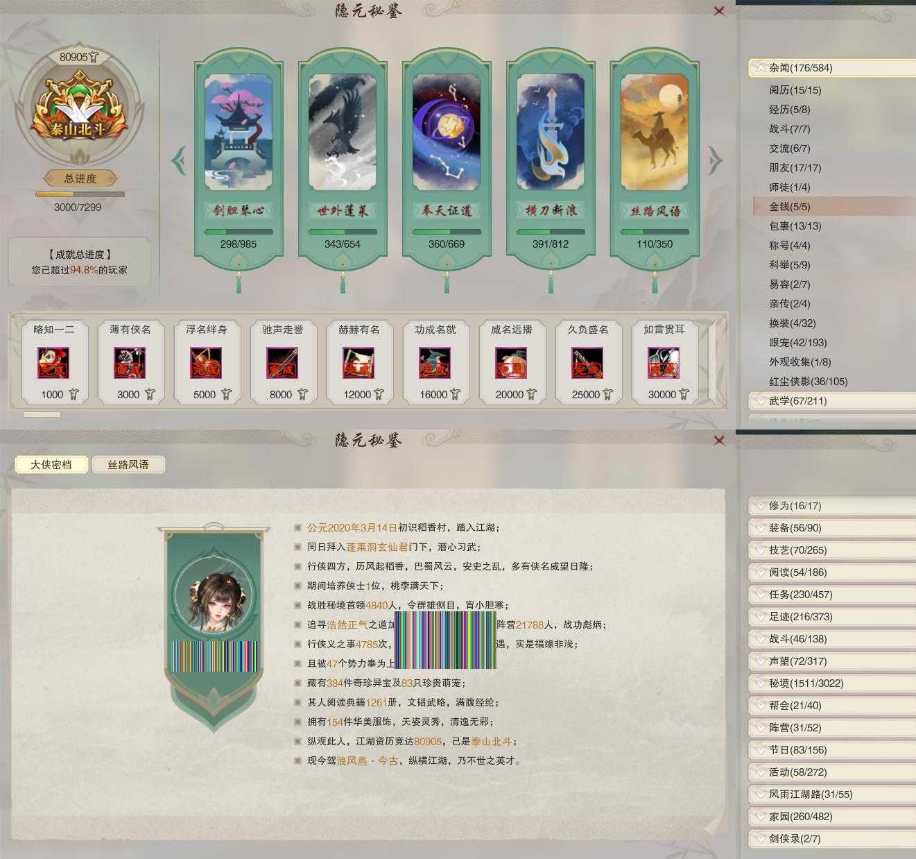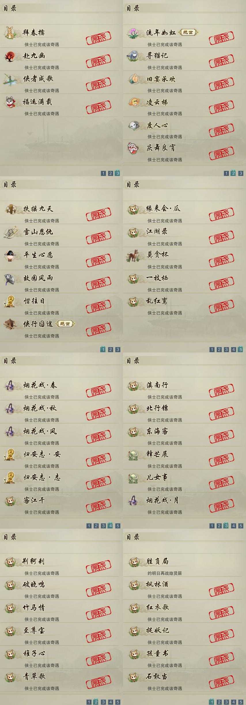 【奇遇】16个[雪山恩仇, 平生心愿, 惜往日, 扶摇九天, 故园风雨, 流年如虹, 寻猫记, 侠行囧途, 庆舞良宵, 凌云梯, 赴九幽, 度人心, 旧宴承欢, 侠者成歌, 拜春擂, 福运满载]