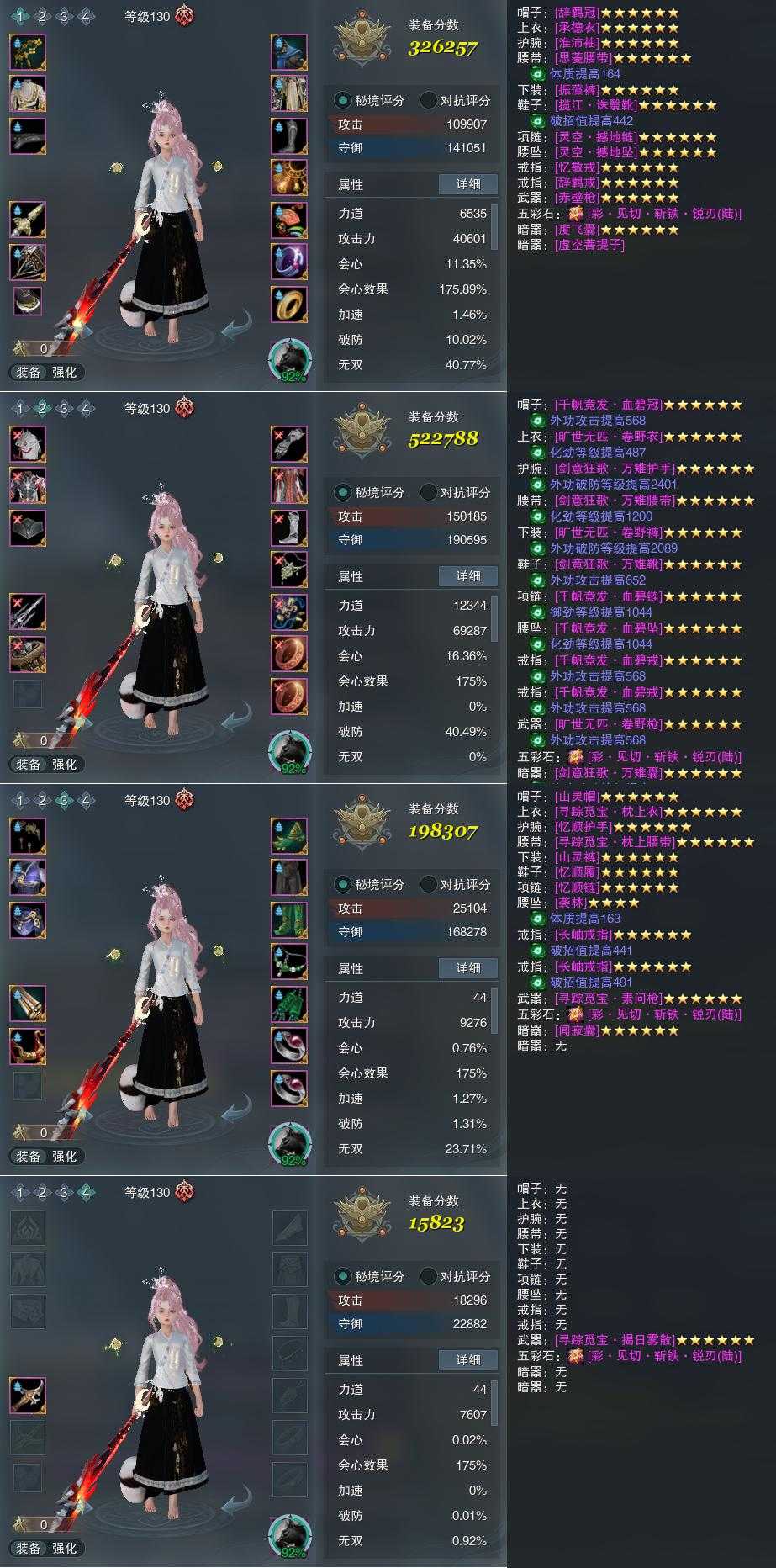 【装备】130级,装备一326257,傲血战意PVP522788,装备三198307,装备四15823