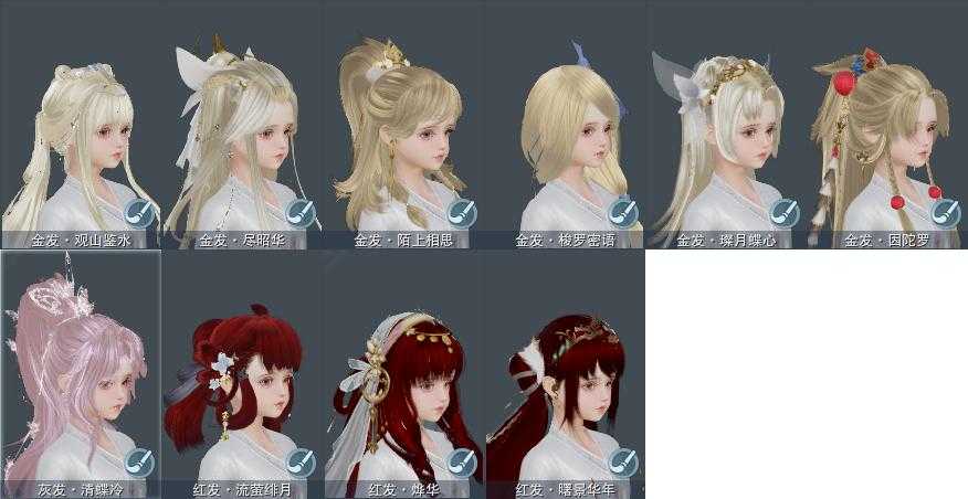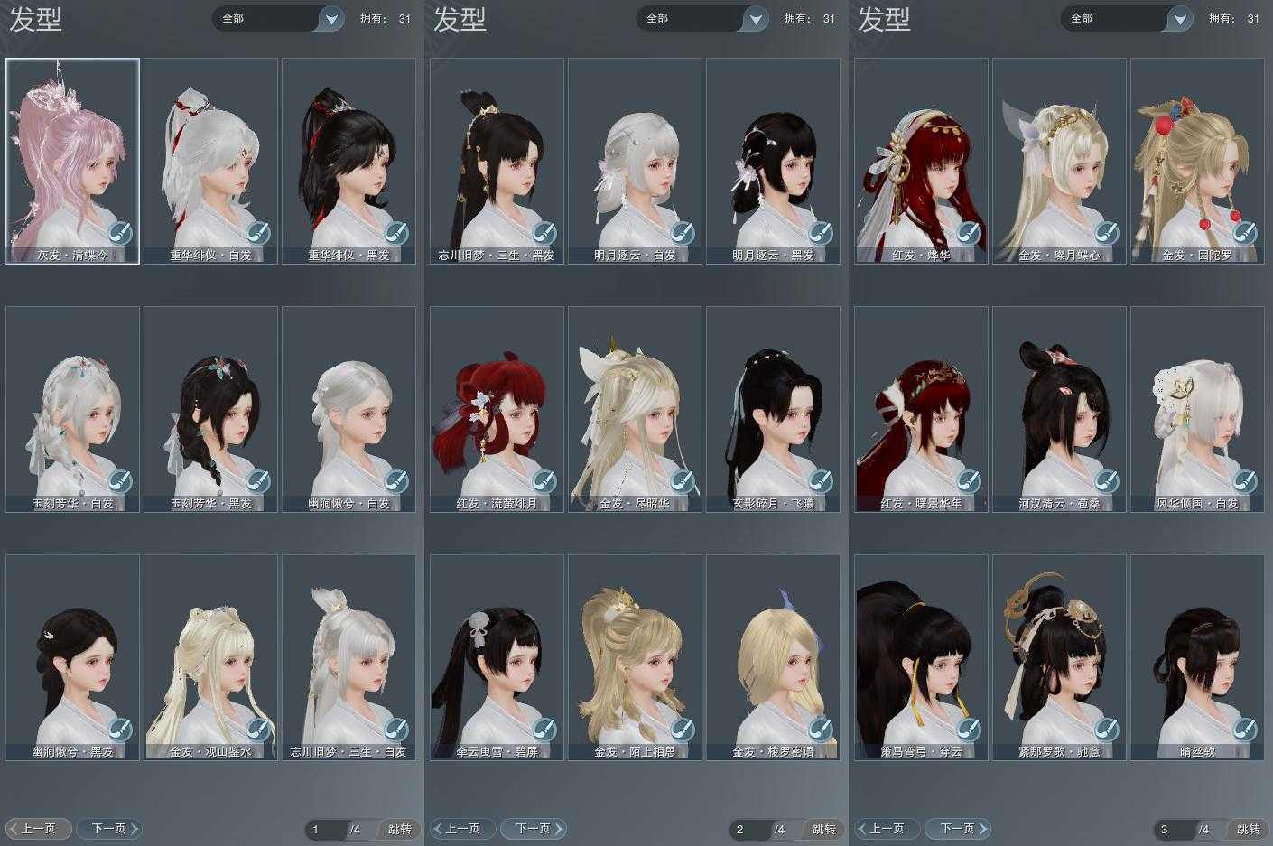 【发型】金发6个[狐金, 猴金, 资历金, 中秋金, 考金, 呱金], 红发4个[七红, 蝶粉, 猴红, 小资历红], 黑发11个, 白发6个, 盒子发型[蝴蝶黑发, 粉忘川黑发, 蝴蝶白发, 粉忘川白发, 幽涧愀兮白发], 总页数4