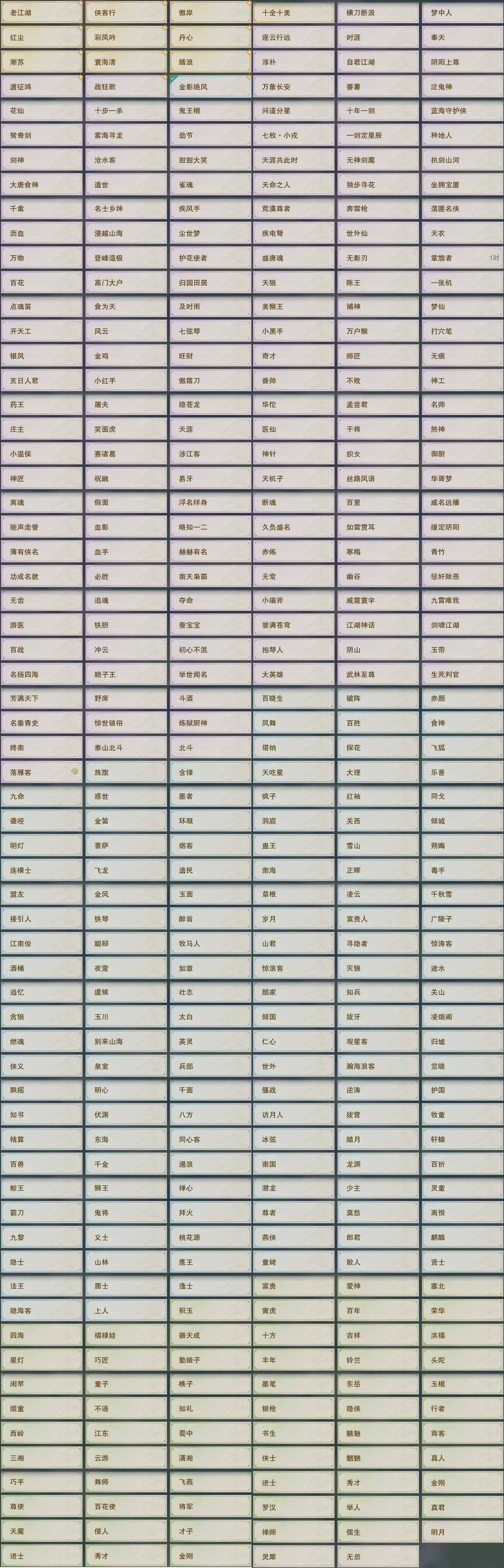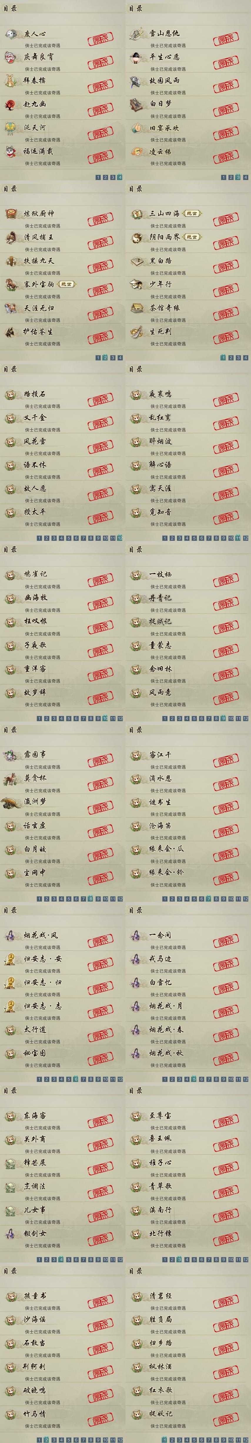 【奇遇】24个[白日梦, 天涯无归, 三山四海, 雪山恩仇, 阴阳两界, 平生心愿, 黑白路, 塞外宝驹, 护佑苍生, 少年行, 故园风雨, 扶摇九天, 清风捕王, 茶馆奇缘, 庆舞良宵, 生死判, 凌云梯, 炼狱厨神, 度人心, 赴九幽, 旧宴承欢, 泛天河, 拜春擂, 福运满载]