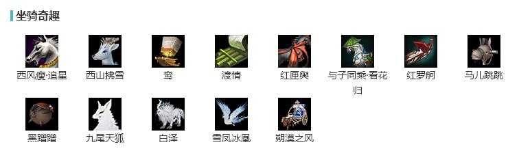 【奇趣】12个[雪凤冰凰, 西山拂雪, 鸾, 渡情, 红匣舆, 与子同乘·看花归, 红罗舸, 马儿跳跳, 黑蹭蹭, 九尾天狐]