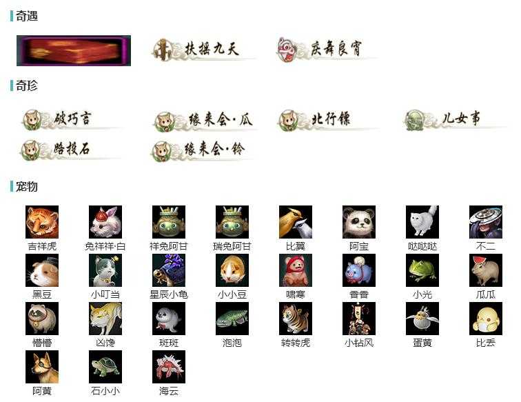 【奇趣】10个[雪凤冰凰, 百年苍郁, 渡情, 红匣舆, 太白仙鹿, 哒哒, 黑蹭蹭, 九尾天狐, 龙宫探骊, 朔漠之风]