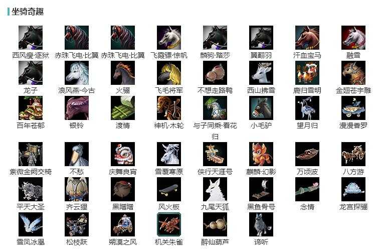 【坐骑】5个[赤珠比翼, 西风瘦逐狱, 飞霞骠惊帆, 飞毛将军, 浪风燕今古]