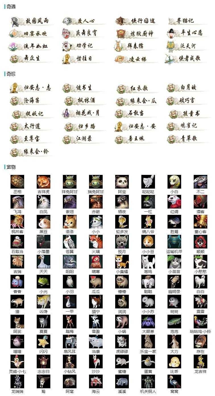 【奇遇】15个[劝学记, 平生心愿, 惜往日, 故园风雨, 流年如虹, 舞众生, 侠行囧途, 寻猫记, 庆舞良宵, 炼狱厨神, 凌云梯, 度人心, 旧宴承欢, 侠者成歌, 拜春擂]