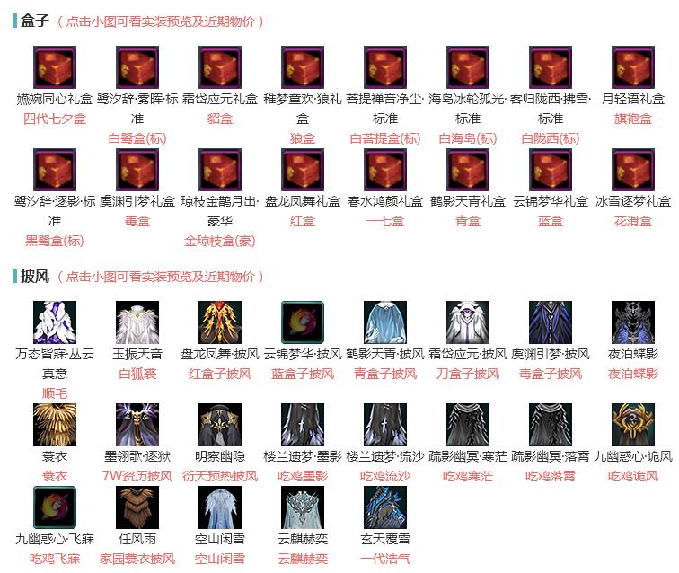 盒子:[红盒, 一七盒, 旗袍盒, 四代七夕盒, 蓝盒, 貂盒, 毒盒, 白菩提盒(标), 青盒, 金琼枝盒(豪), 白海岛(标), 花滑盒, 狼盒, 白鹭盒(标), 黑鹭盒(标), 白陇西(标)]