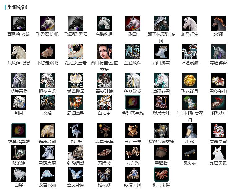 【坐骑】6个[西风瘦炎流, 飞霞骠惊帆, 飞霞骠黑云, 乌蹄抱月, 翻羽抹云驹旋风, 白龙马]