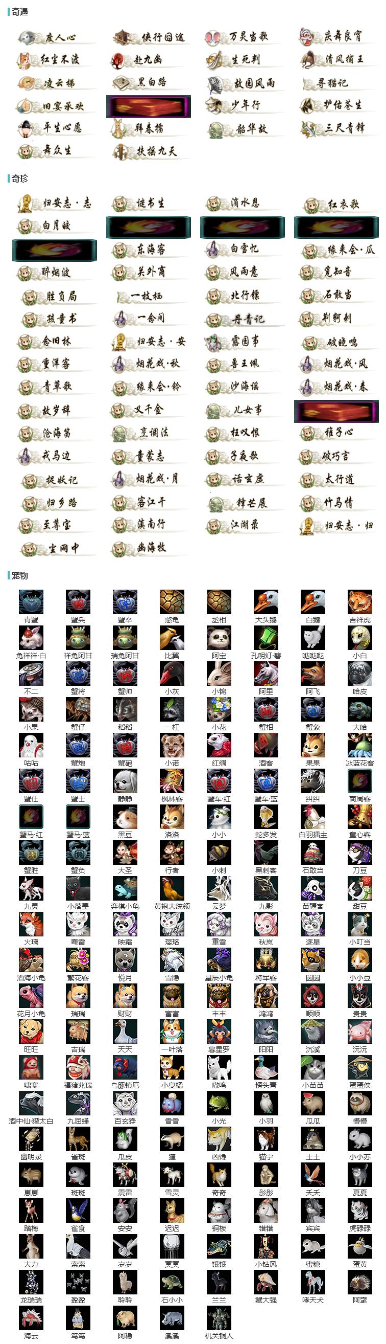 【奇遇】22个[黑白路, 平生心愿, 韶华故, 少年行, 护佑苍生, 三尺青锋, 扶摇九天, 故园风雨, 清风捕王, 舞众生, 侠行囧途, 寻猫记, 万灵当歌, 生死判, 庆舞良宵, 凌云梯, 度人心, 赴九幽, 旧宴承欢, 红尘不渡, 拜春擂, 沙海劫缘]