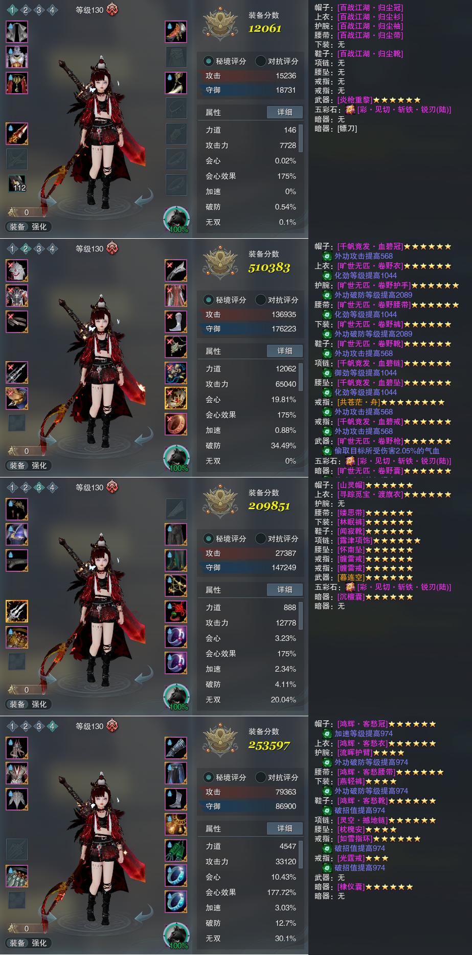 【装备】130级,装备一12061,傲血战意装备二510383,装备三209851,装备四253597