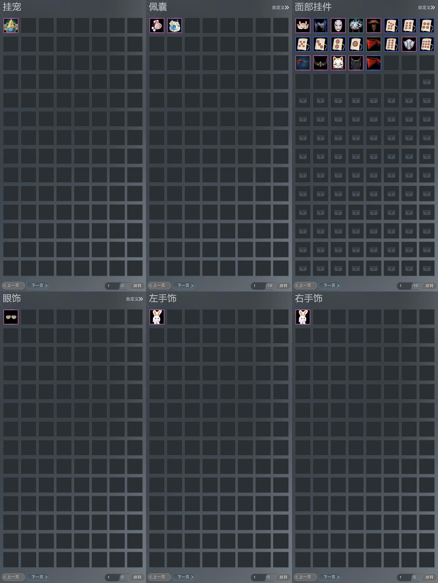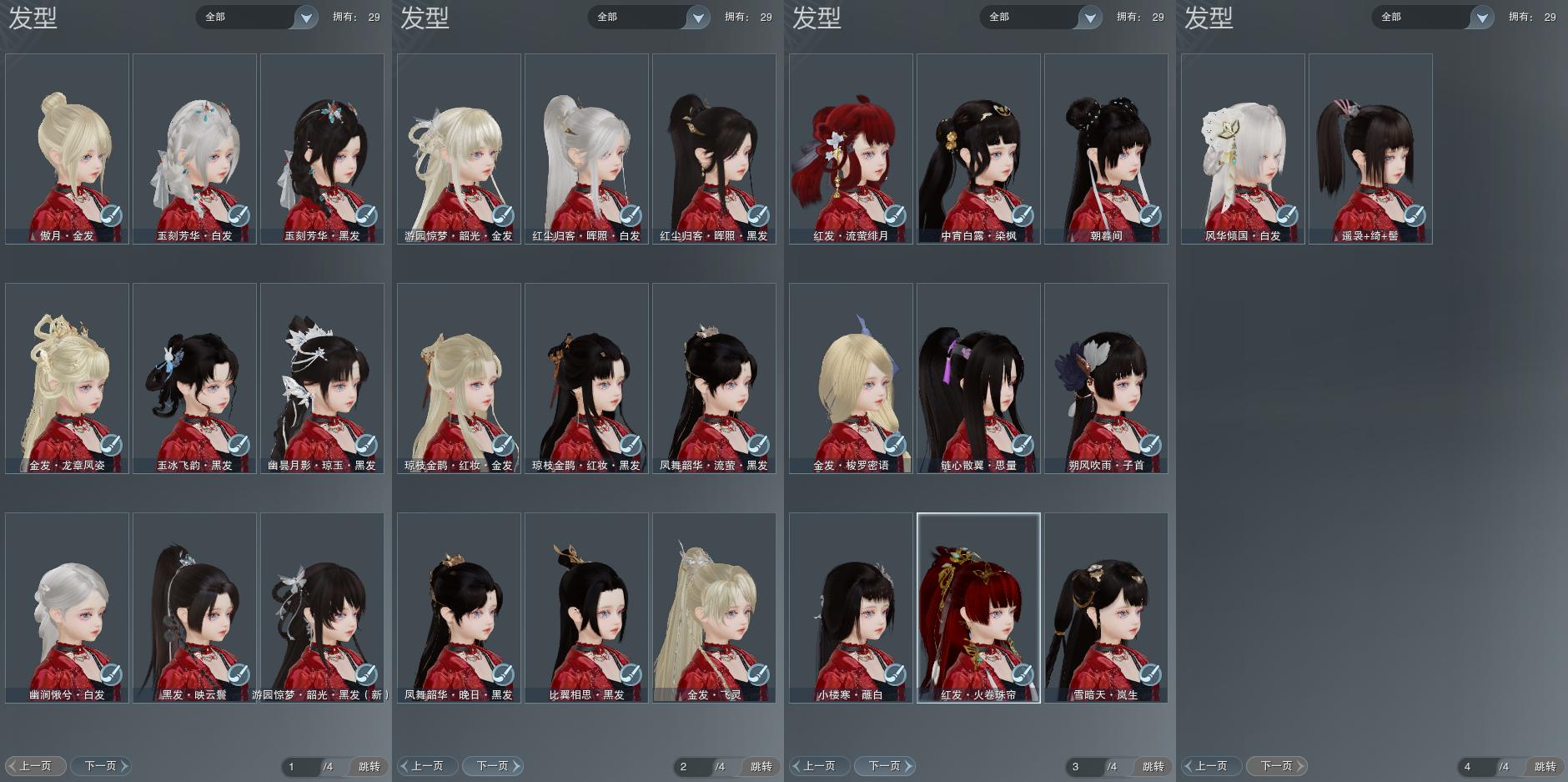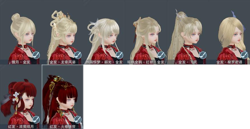 【发型】金发7个[资历金, 飒金, 巴卡金, 龙金, 傲月金发, 红琼枝金发, 白游园金发], 红发2个[六红, 小资历红], 黑发16个, 白发4个, 盒子发型[五代七夕黑发, 晚日黑发, 流萤黑发, 红琼枝黑发, 黑红尘黑发, 新白游园黑, 黑红尘白发, 白幽昙黑发, 幽涧愀兮白发, 蓝兔盒黑发], 总页数4