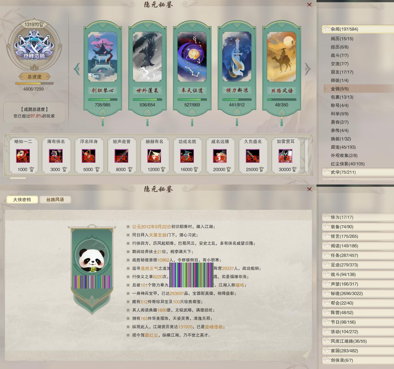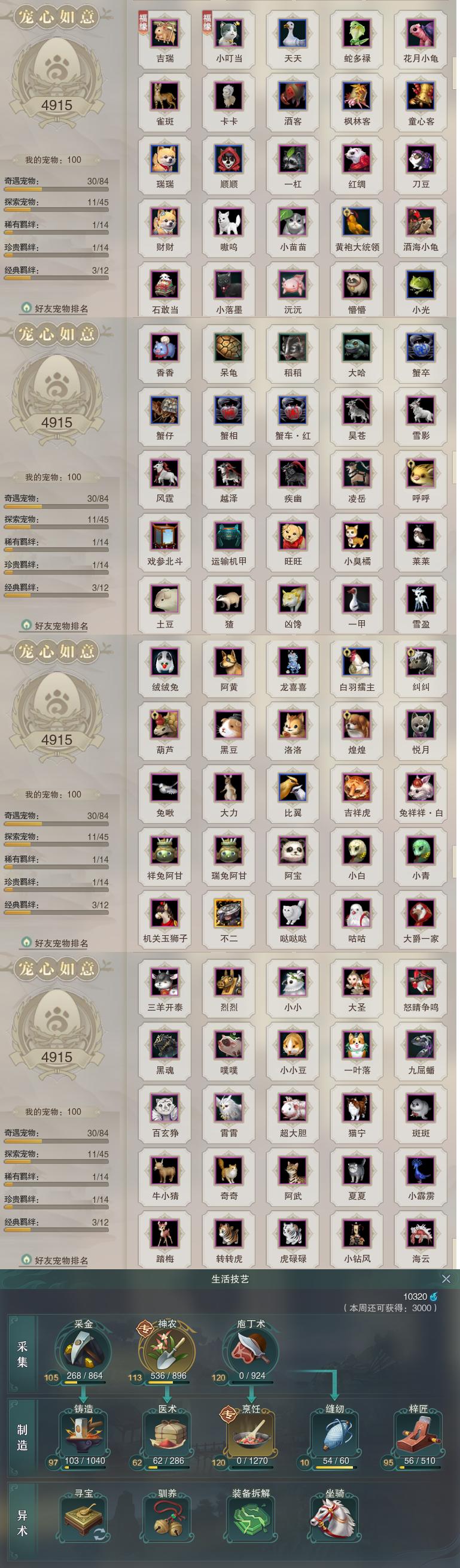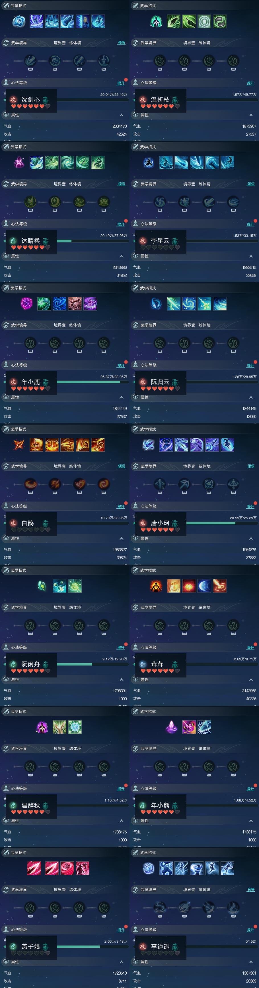 【同伴】沈剑心81级境界壹,温折枝79级境界壹,沐晴柔77级境界壹,李星云76级境界壹,年小鹿75级境界壹,阮归云75级境界壹,白鹊75级境界壹,唐小珂74级境界壹,阮闲舟69级境界壹,茸茸66级境界壹,温辞秋61级境界壹,年小熊61级境界壹,燕子娘59级境界壹,李逍遥1级境界壹