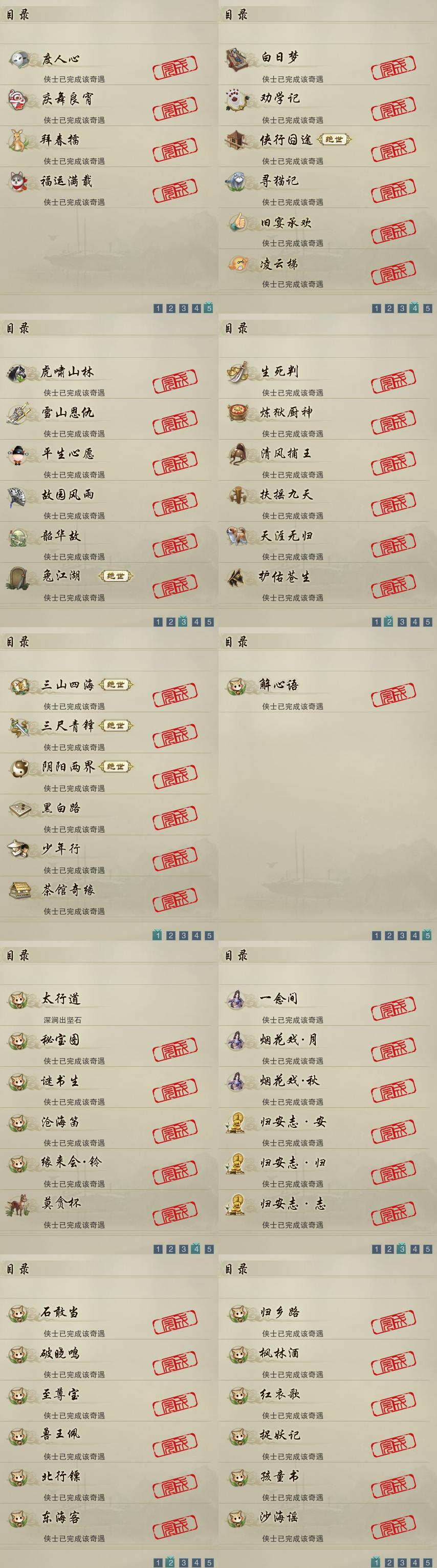 【奇遇】28个[白日梦, 天涯无归, 三山四海, 劝学记, 雪山恩仇, 阴阳两界, 平生心愿, 兔江湖, 黑白路, 虎啸山林, 韶华故, 护佑苍生, 少年行, 故园风雨, 扶摇九天, 三尺青锋, 清风捕王, 侠行囧途, 寻猫记, 茶馆奇缘, 庆舞良宵, 生死判, 凌云梯, 炼狱厨神, 度人心, 旧宴承欢, 拜春擂, 福运满载]