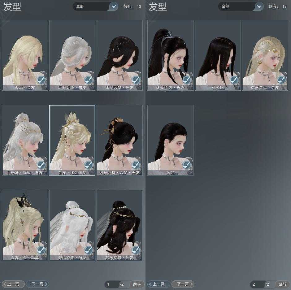 【发型】金发4个[苏金, 苍金, 牛金, 玄江金发], 红发0个[], 黑发5个, 白发3个, 盒子发型[丝路黑, 丝路白, 入梦黑发, 白明光白发], 总页数2