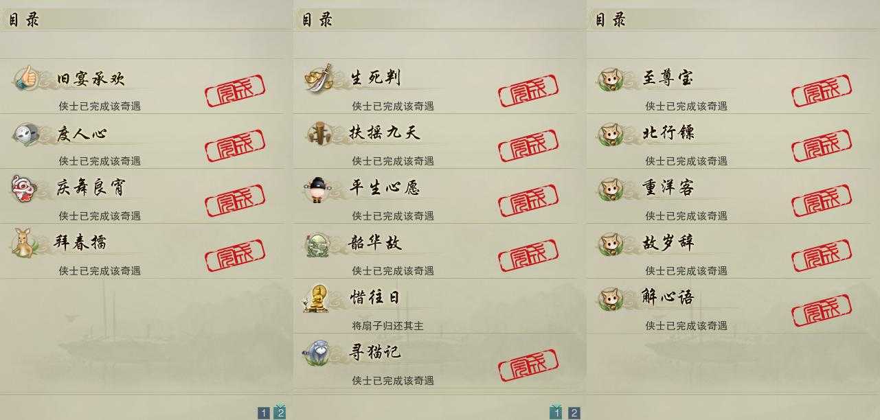 【奇遇】10个[平生心愿, 惜往日, 韶华故, 扶摇九天, 寻猫记, 庆舞良宵, 生死判, 度人心, 旧宴承欢, 拜春擂]
