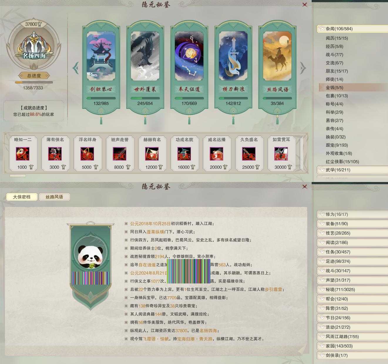 【同伴】沈剑心72级境界壹,沐晴柔69级境界壹,温辞秋61级境界壹,茸茸61级境界壹,卫庄61级境界壹,年小鹿60级境界壹,阮闲舟60级境界壹,李逍遥59级境界壹,盖聂58级境界壹,年小熊17级境界壹,温折枝2级境界壹,阮归云2级境界壹,康宴别级,唐小珂级,李星云级,月嘉禾级,贺闲级,费大劲级,白鹊级,赵灵儿级