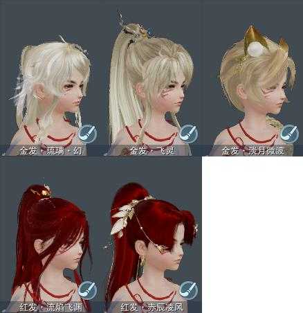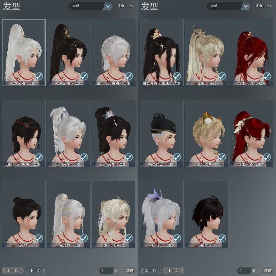 【发型】金发3个[倒闭金, 飒金, 海金], 红发2个[八红, 九红], 黑发7个, 白发5个, 盒子发型[狄仁杰白, 红幽昙黑发, 青霄盒黑发, 红上火黑发, 红上火白发, 墨龙盒黑发, 墨龙盒白发], 总页数2