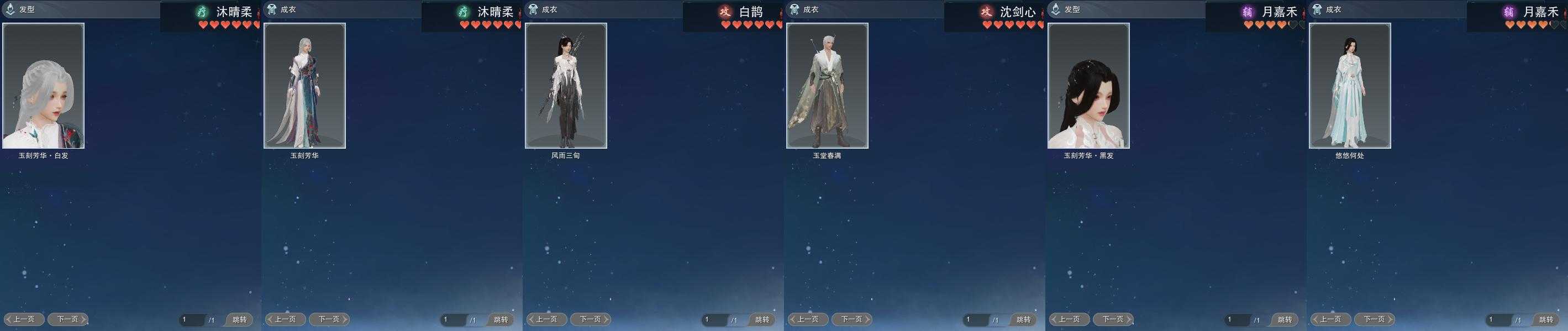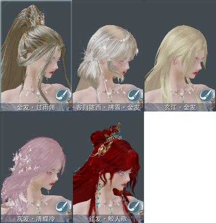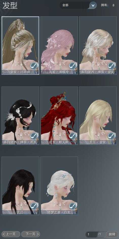 【发型】金发3个[玄江金发, 翎金, 白陇西金发], 红发2个[蝶粉, 十五红], 黑发3个, 白发2个, 盒子发型[婚纱盒白发, 白陇西黑发], 总页数1