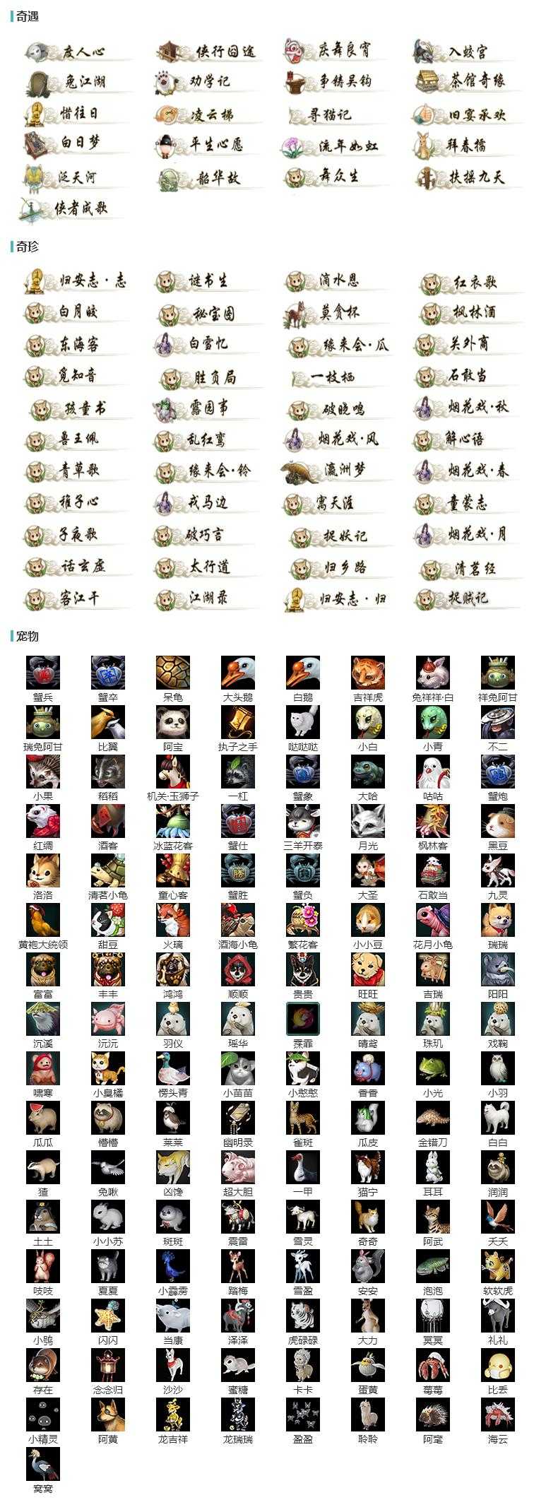 【奇遇】20个[白日梦, 劝学记, 兔江湖, 平生心愿, 惜往日, 争铸吴钩, 韶华故, 扶摇九天, 流年如虹, 舞众生, 侠行囧途, 茶馆奇缘, 寻猫记, 庆舞良宵, 入蛟宫, 凌云梯, 度人心, 旧宴承欢, 侠者成歌, 拜春擂]