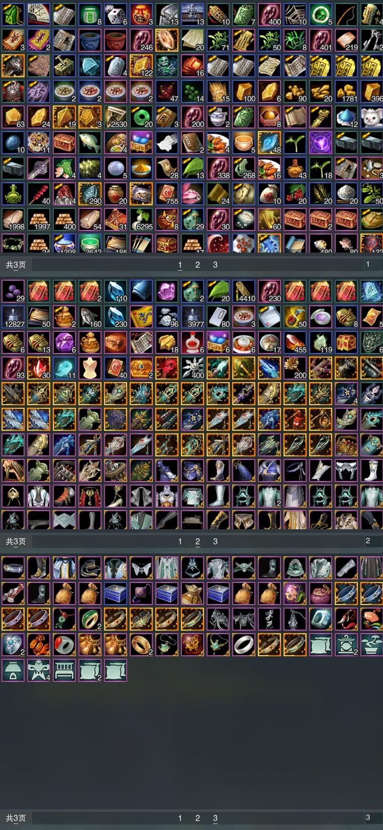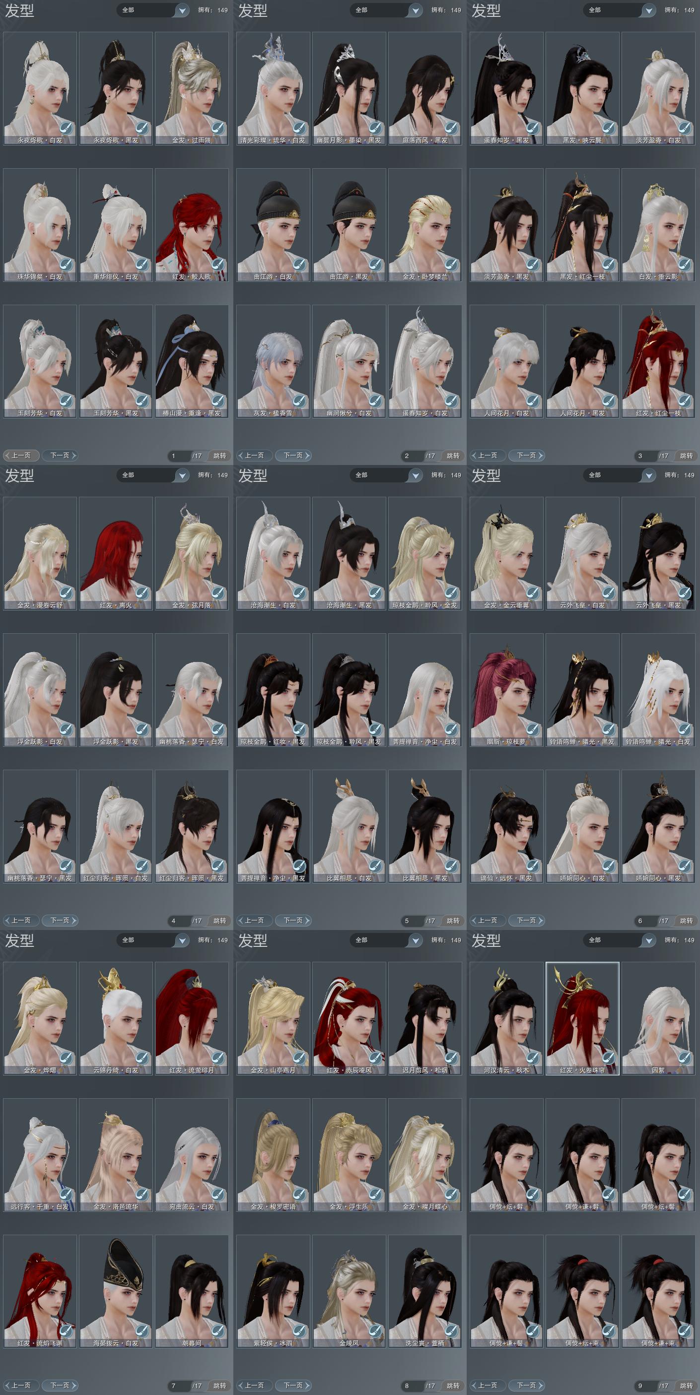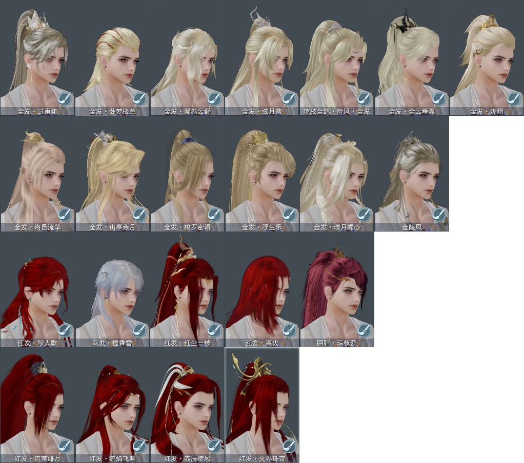 【发型】金发13个[一代金, 狐金, 资历金, 喵金, 国金, 玫瑰金, 猪金, 苍金, 巴卡金, 云金, 女仆金, 翎金, 白琼枝金发], 红发9个[六红, 八红, 九红, 十二红, 紫发, 小资历红, 大资历红, 十五红, 一代灰], 黑发28个, 白发25个, 盒子发型[曲江游白发, 四代七夕黑发, 黑谪仙黑发, 狄仁杰白, 二代元宵白, 二代重阳白, 白楼兰黑发, 蓝腿白, 四代七夕白发, 飞皇黑发, 五代七夕黑发, 白楼兰白发, 净尘黑发, 飞皇白发, 五代七夕白发, 白琼枝黑发, 红琼枝黑发, 沧海黑发, 净尘白发, 黑红尘黑发, 原色幽香黑发, 沧海白发, 小金龙黑发, 黑红尘白发, 原色幽香白发, 小金龙白发, 十二黑, 芙蓉黑发, 六代中秋黑发, 芙蓉白发, 六代中秋白发, 哒白, 红梅盒黑发, 红梅盒白发, 曲江游黑发, 黑幽昙黑发, 幽涧愀兮白发, 蓝椿山黑发, 蓝钻石盒白发, 傀儡黑发, 傀儡白发], 总页数9
