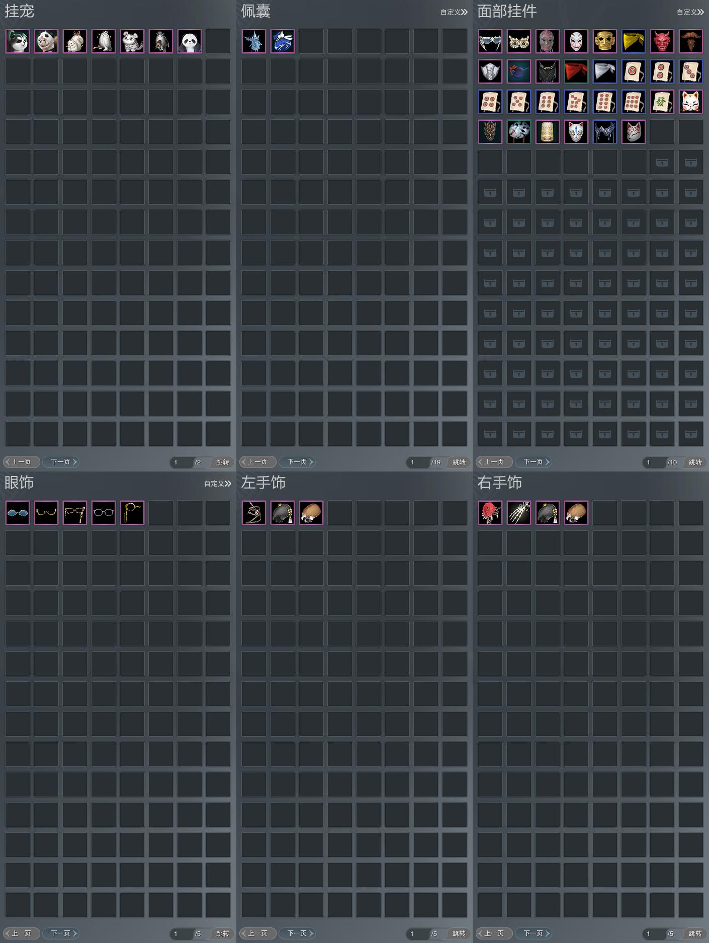 盒子:[黑盒, 叽盒, 秃盒, 狄盒(缺腰挂), 歌盒, 二代万花盒, 四代七夕盒, 蘑菇盒, 五七盒, 蓝腿盒, 灯盒, 白菩提盒(豪), 青盒, 二代重阳盒, 唐盒, 苍盒, 二代元宵盒, 丐盒, 白琼枝盒(豪), 红琼枝盒(标), 沧海盒, 白楼兰盒, 黑四元盒, 六中盒, 小金龙盒, 芙蓉盒, 红梅盒, 曲江盒, 黑幽昙(标), 蓝椿山盒(标), 傀儡盒(缺背挂)]