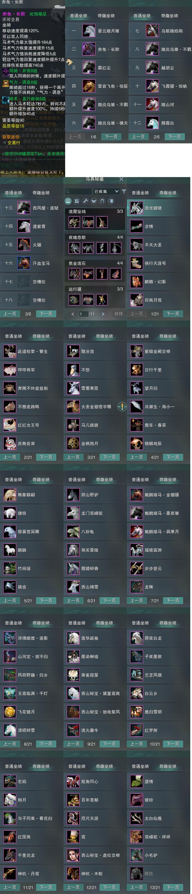 【坐骑】16个[踏炎不羁, 踏炎不羁, 踏炎横天, 西风瘦逐狱, 星云踏月骓, 飞霞骠惊帆, 赤兔长歌, 霸红尘, 雷首飞电惊辰, 乌鬃踏焰驹]
