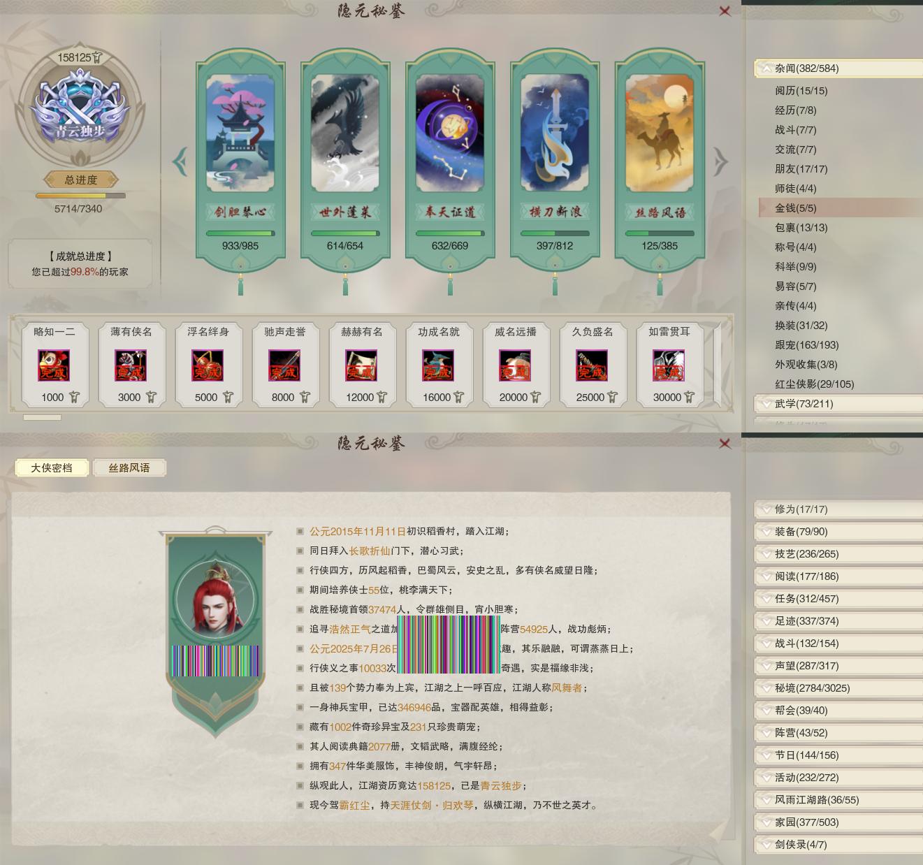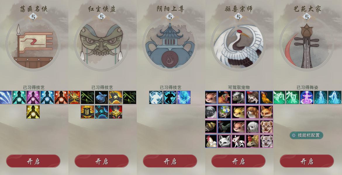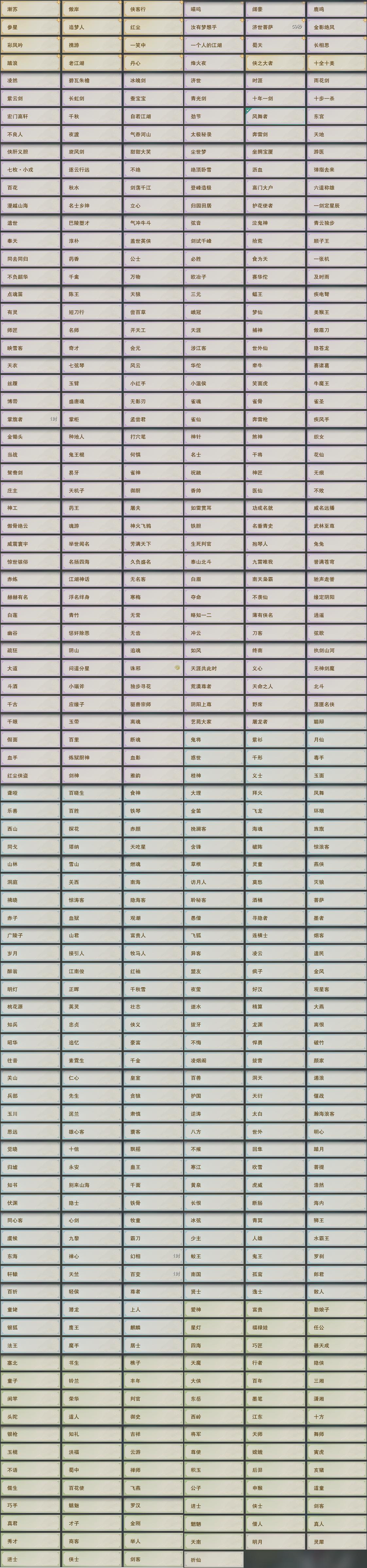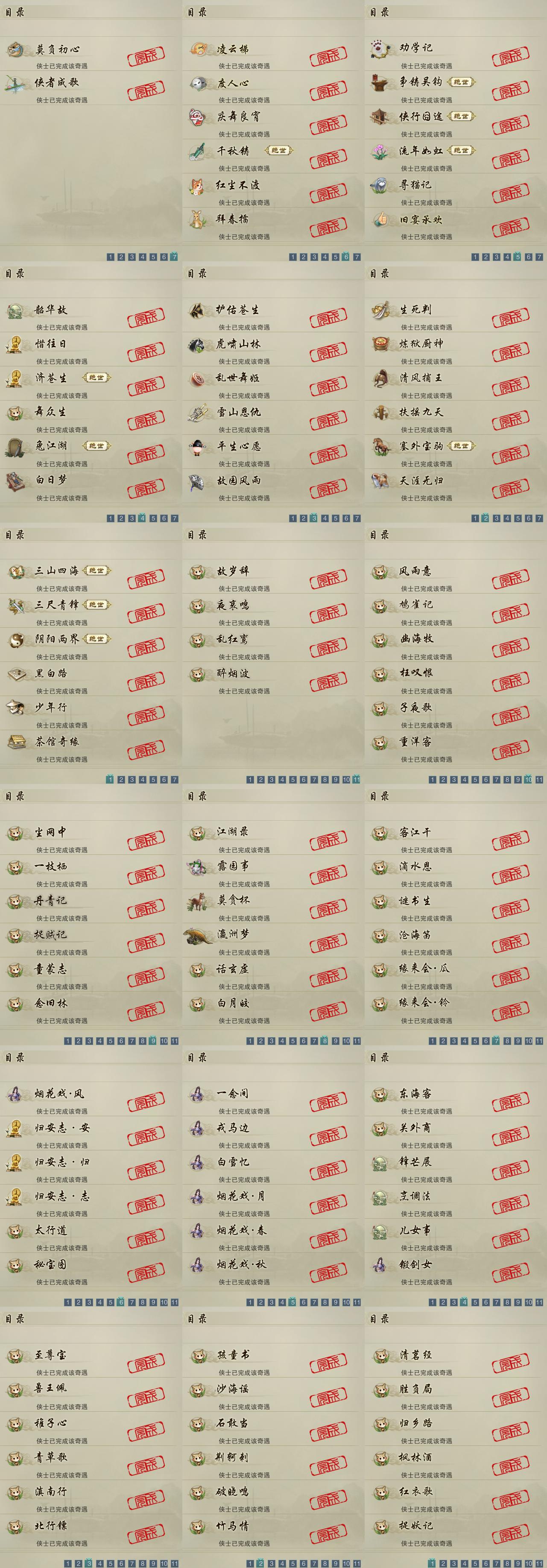 【奇遇】38个[白日梦, 天涯无归, 三山四海, 劝学记, 雪山恩仇, 阴阳两界, 莫负初心, 兔江湖, 平生心愿, 黑白路, 惜往日, 乱世舞姬, 塞外宝驹, 争铸吴钩, 韶华故, 虎啸山林, 济苍生, 护佑苍生, 少年行, 故园风雨, 扶摇九天, 三尺青锋, 流年如虹, 舞众生, 清风捕王, 侠行囧途, 寻猫记, 茶馆奇缘, 庆舞良宵, 生死判]