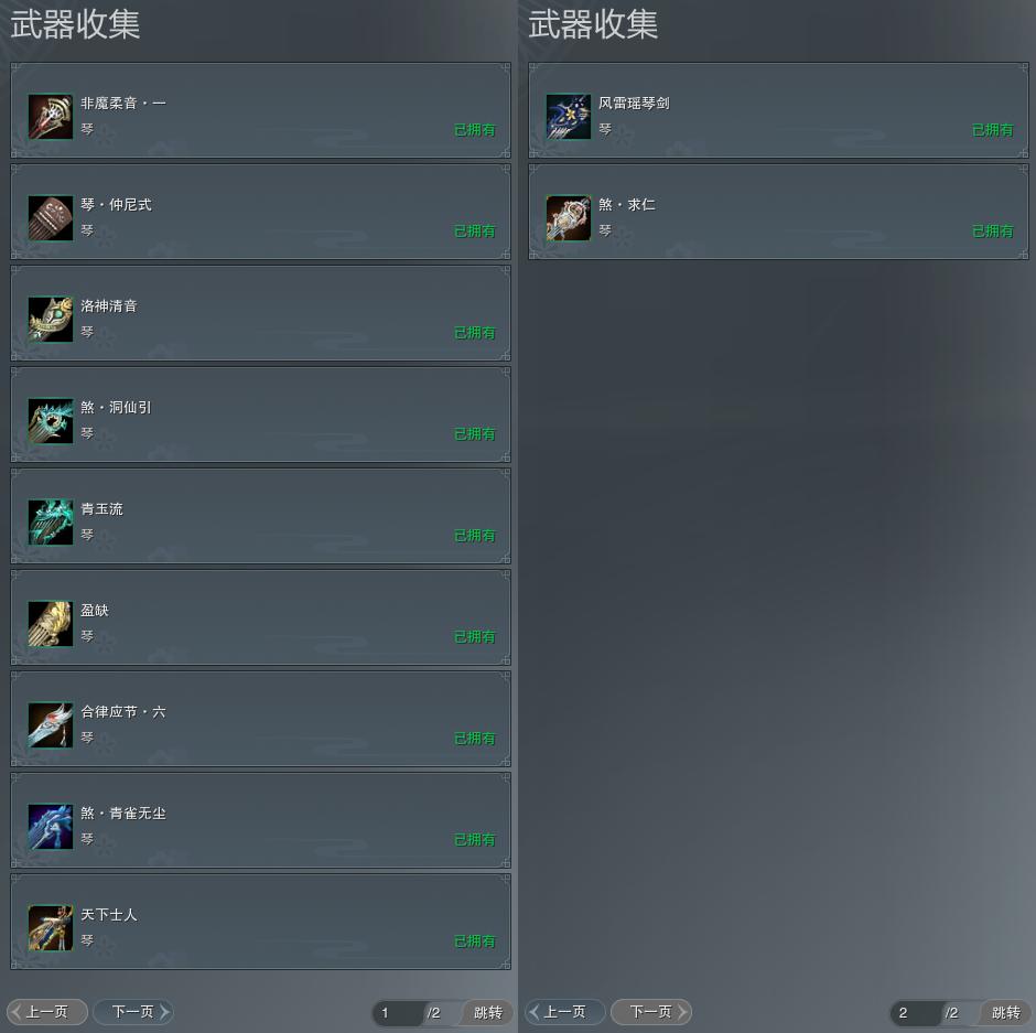 【拓印】11页外观收集,11武器拓印,拓印80CW落神清音,拓印90奇遇CW煞·洞仙引,拓印95CW青玉流,拓印95CW盈缺,拓印100小CW合律应节,拓印100奇遇CW煞·青雀无尘,拓印110CW天下士人,拓印门派特效风雷瑶琴剑,拓印110奇遇CW煞求仁