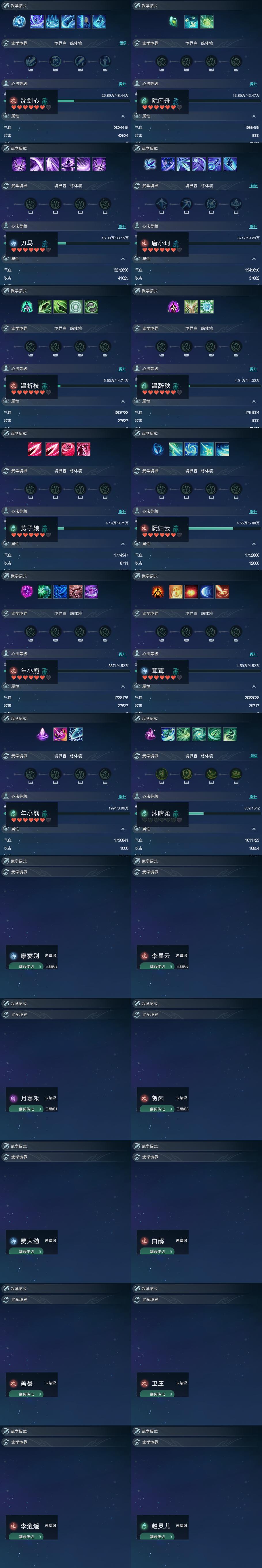 【同伴】沈剑心80级境界壹,阮闲舟78级境界壹,刀马76级境界壹,唐小珂72级境界壹,温折枝70级境界壹,温辞秋68级境界壹,燕子娘66级境界壹,阮归云63级境界壹,年小鹿61级境界壹,茸茸61级境界壹,年小熊60级境界壹,沐晴柔7级境界壹,康宴别级,李星云级,月嘉禾级,贺闲级,费大劲级,白鹊级,盖聂级,卫庄级,李逍遥级,赵灵儿级