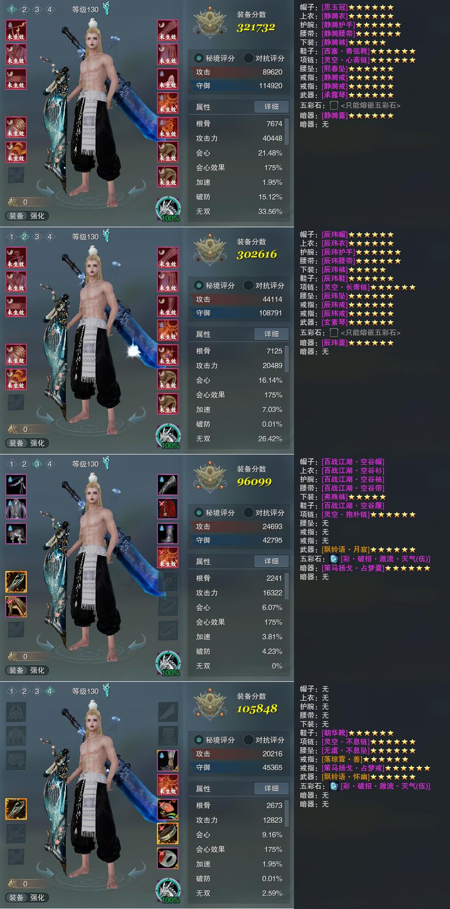 【装备】130级,装备一321732,装备二302616,装备三96099,装备四105848