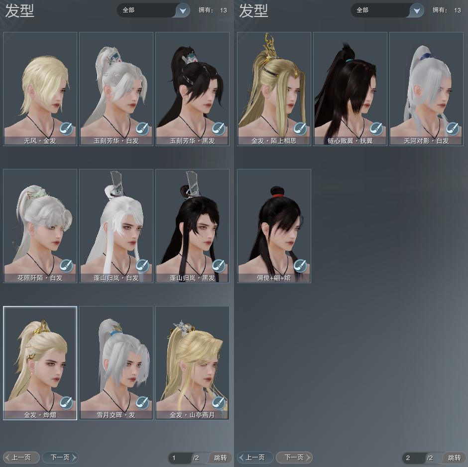 【发型】金发4个[考金, 国金, 猪金, 无风金发], 红发0个[], 黑发3个, 白发5个, 盒子发型[二代花朝黑, 雪月白发, 二代花朝白, 踏青白发], 总页数2