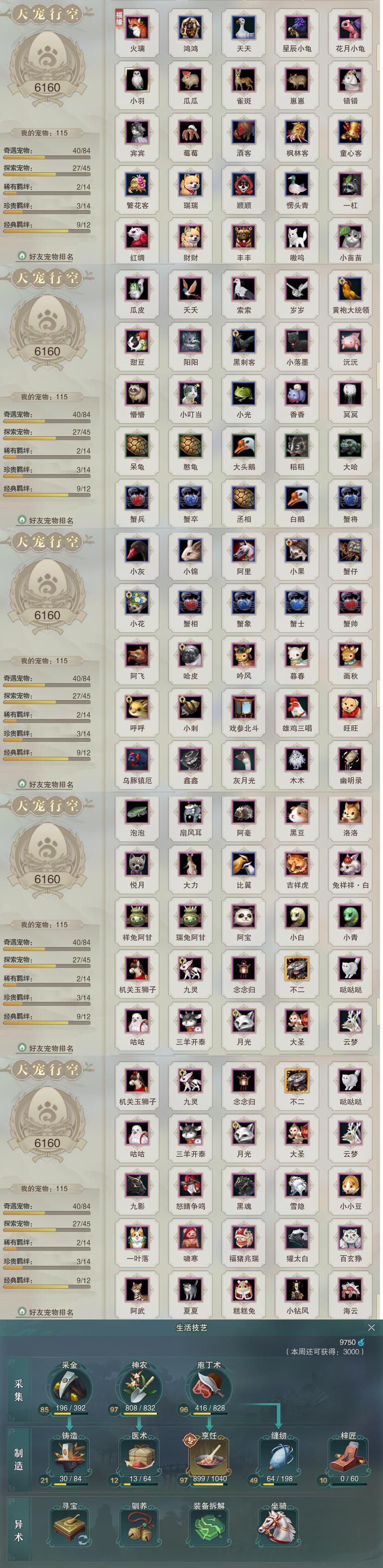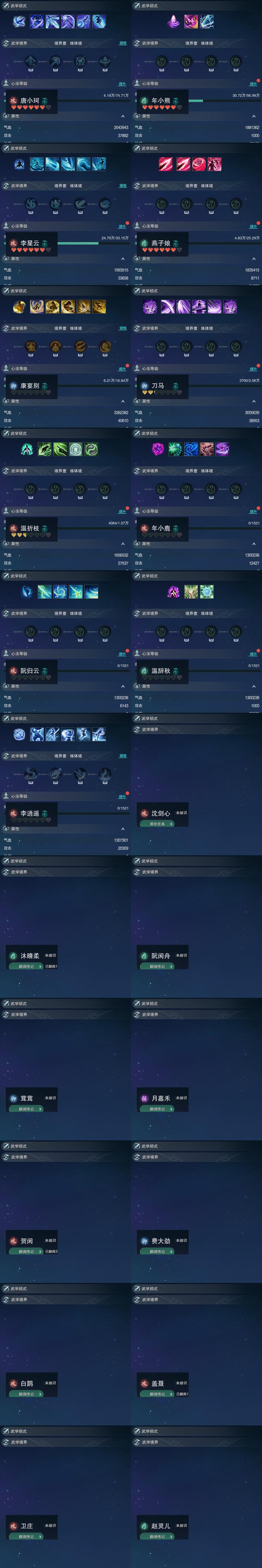 【同伴】唐小珂82级境界壹,年小熊80级境界壹,李星云76级境界壹,燕子娘74级境界壹,康宴别71级境界壹,刀马55级境界壹,温折枝50级境界壹,年小鹿1级境界壹,阮归云1级境界壹,温辞秋1级境界壹,李逍遥1级境界壹,沈剑心级,沐晴柔级,阮闲舟级,茸茸级,月嘉禾级,贺闲级,费大劲级,白鹊级,盖聂级,卫庄级,赵灵儿级