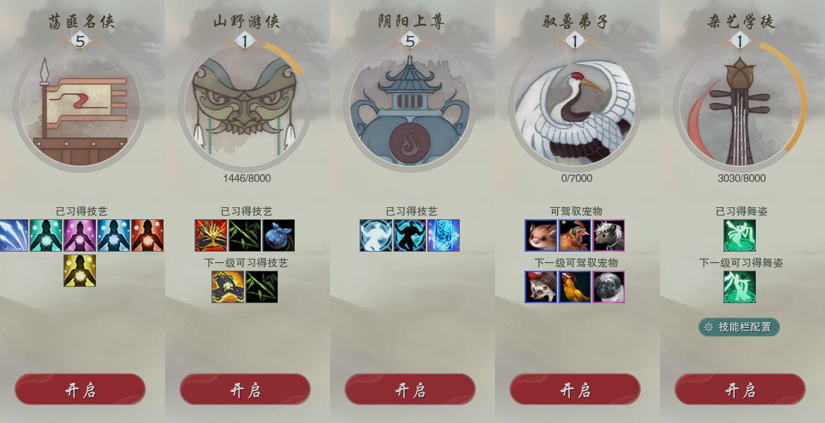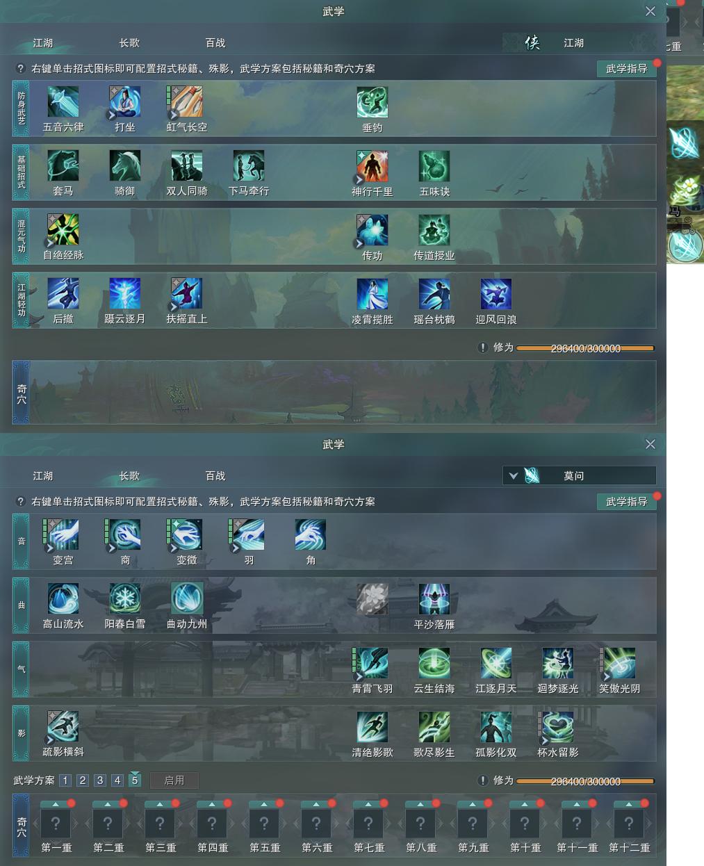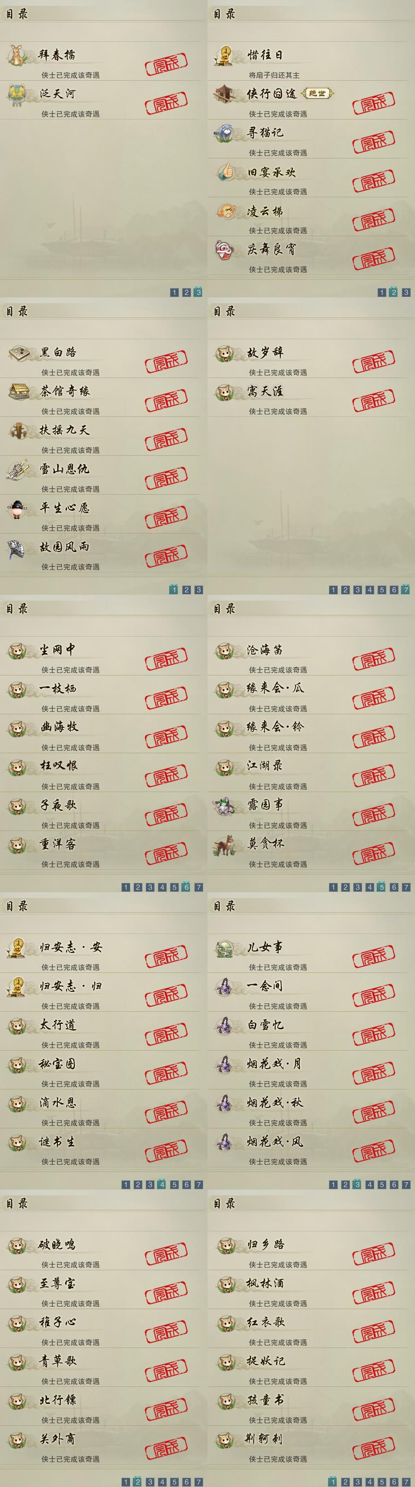 【奇遇】14个[雪山恩仇, 黑白路, 平生心愿, 惜往日, 扶摇九天, 故园风雨, 侠行囧途, 寻猫记, 茶馆奇缘, 庆舞良宵, 凌云梯, 旧宴承欢, 泛天河, 拜春擂]