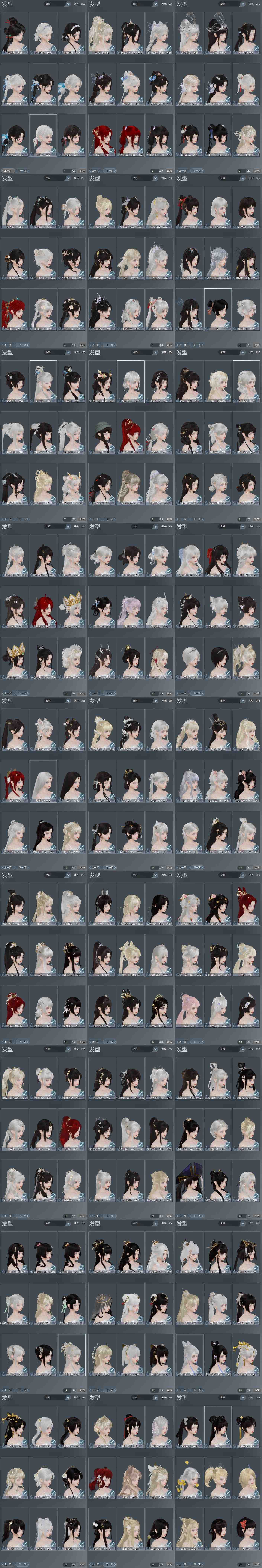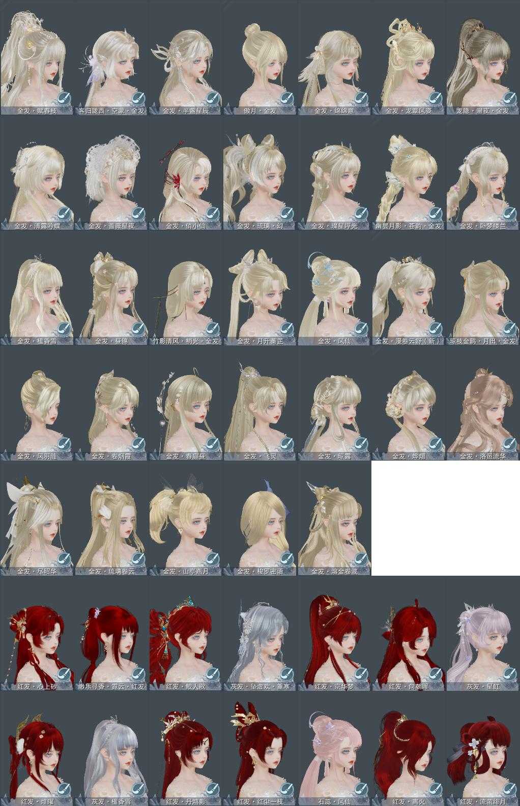 【发型】金发33个[资历金, 鼠金, 中秋金, 蝶金, 国金, 龙女金, 玫瑰金, 猪金, 珊瑚金, 飒金, 角金, 凤金, 新云金, 凤仙金, 香蕉金, 虎金, 一代灰金, 女仆金, 雪金, 海金, 刺金, 蔷薇金, 水母金, 龙金, 咩金, 傲月金发, 精灵金, 蛇金, 澄琼枝金发, 竹影梢光金发, 绿幽昙金发, 黑龙隐金发, 彩陇西金发], 红发14个[十二红, 十四红, 凤仙粉, 虎红, 兔红, 小资历红, 龙红, 大资历红, 十五红, 蛇红, 紫寻香红发, 二代灰, 一代灰, 三代灰银], 黑发116个, 白发79个, 盒子发型[新绿中秋白发, 二代花朝黑, 丝路黑, 狄仁杰黑, 泠月黑发, 一代重阳白, 踏云黑发, 四代七夕黑发, 四代中秋蓝黑发, 小白龙黑发, 黑谪仙黑发, 乘风黑发, 晴岚绘黑发, 山吹樱雪黑发, 棉袄白, 白楼兰黑发, 二代花朝白, 白如归黑发, 泠月白发, 踏云白发, 四代七夕白发, 飞皇黑发, 幽阑黑发, 四代中秋蓝白发, 小白龙白发, 绿中秋黑发, 乘风白发, 晴岚绘白发, 黑同人黑发, 山吹樱雪白发, 粉同人黑发, 白楼兰白发, 浮岚黑发, 净尘黑发, 飞皇白发, 幽阑白发, 薄雾黑发, 蓝曲塘黑, 澄琼枝黑发, 浮岚白发, 沧海黑发, 黑红尘黑发, 月轻语白发, 蓝曲塘白, 原色幽香黑发, 沧海白发, 小金龙黑发, 新白游园黑, 黑红尘白发, 白明光黑发, 竹笛黑发, 小熊黑发, 孔雀黑发, 紫幽香白发, 小金龙白发, 白六七黑发, 十二黑, 芙蓉黑发, 六代中秋黑发, 哒黑, 白明光白发, 竹笛白发, 小熊白发, 孔雀白发, 竹影梢光黑发, 白六七白发, 芙蓉白发, 六代中秋白发, 白懒猪黑发, 蝴蝶黑发, 花滑黑发, 星源黑发, 粉忘川黑发, 黑人间黑发, 蝴蝶白发, 花滑白发, 星源白发, 羊盒黑发, 箜篌黑发, 粉忘川白发, 羊盒白发, 竹露响紫檀黑发, 乘梦虚舟黑发, 绿幽昙黑发, 雏菊黑发, 三代福袋白发, 幽涧愀兮白发, 乘梦虚舟白发, 镖盒黑发, 黑傣族黑发, 雏菊白发, 除夕盒黑发, 卿酒盒黑发, 蓝钻石盒黑发, 镖盒白发, 不良人盒黑发, 黑傣族白发, 红椿山黑发, 踏青黑发, 除夕盒白发, 蓝钻石盒白发, 灵龙盒黑发, 不良人盒白发, 蓝兔盒黑发, 圆舞盒黑发, 蓝椿山白发, 踏青白发, 黑沧洲盒黑发, 西游盒黑发, 灵龙白发, 蓝兔盒白发, 八七盒黑发, 圆舞盒白发, 黑八中黑发, 六代重阳黑发, 西游盒白发, 青山盒黑发, 天星盒黑发, 八七盒白发, 黑龙隐黑发, 黑八中白发, 六代重阳白发, 游龙盒黑发, 青山盒白发, 婚纱盒黑发, 天星盒白发, 粉鹿黑发, 蓝龙隐白发, 海阔盒黑发, 游龙盒白发, 熊猫黑发, 茄盒黑发, 婚纱盒白发, 粉鹿白发, 黑鹭黑发, 蓝鹭黑发, 龙吟盒黑发, 莲台盒黑发, 梦盒黑发, 兰陵盒黑发, 海阔盒白发, 紫月下黑发, 熊猫白发, 茄盒白发, 九七黑发, 白蛇盒黑发, 柿盒黑发, 龙吟盒白发, 莲台盒白发, 梦盒白发, 兰陵盒白发, 人间夜色黑发, 九七白发, 蓝千山黑发, 柿盒白发, 白蛇盒白发, 瑞雪盒黑发, 彩陇西黑发, 人间夜色白发, 燕月盒黑发, 紫寻香黑发, 瑶华盒黑发, 瑞雪盒白发, 蓝蝴蝶黑发, 燕月盒白发, 绿故梦黑发, 重花游黑发, 瑶华盒白发, 仙剑黑发, 潮涌盒黑发, 蓝蝴蝶白发, 瓷盒黑发, 仙剑白发, 重花游白发, 潮涌盒白发, 瓷盒白发], 总页数27