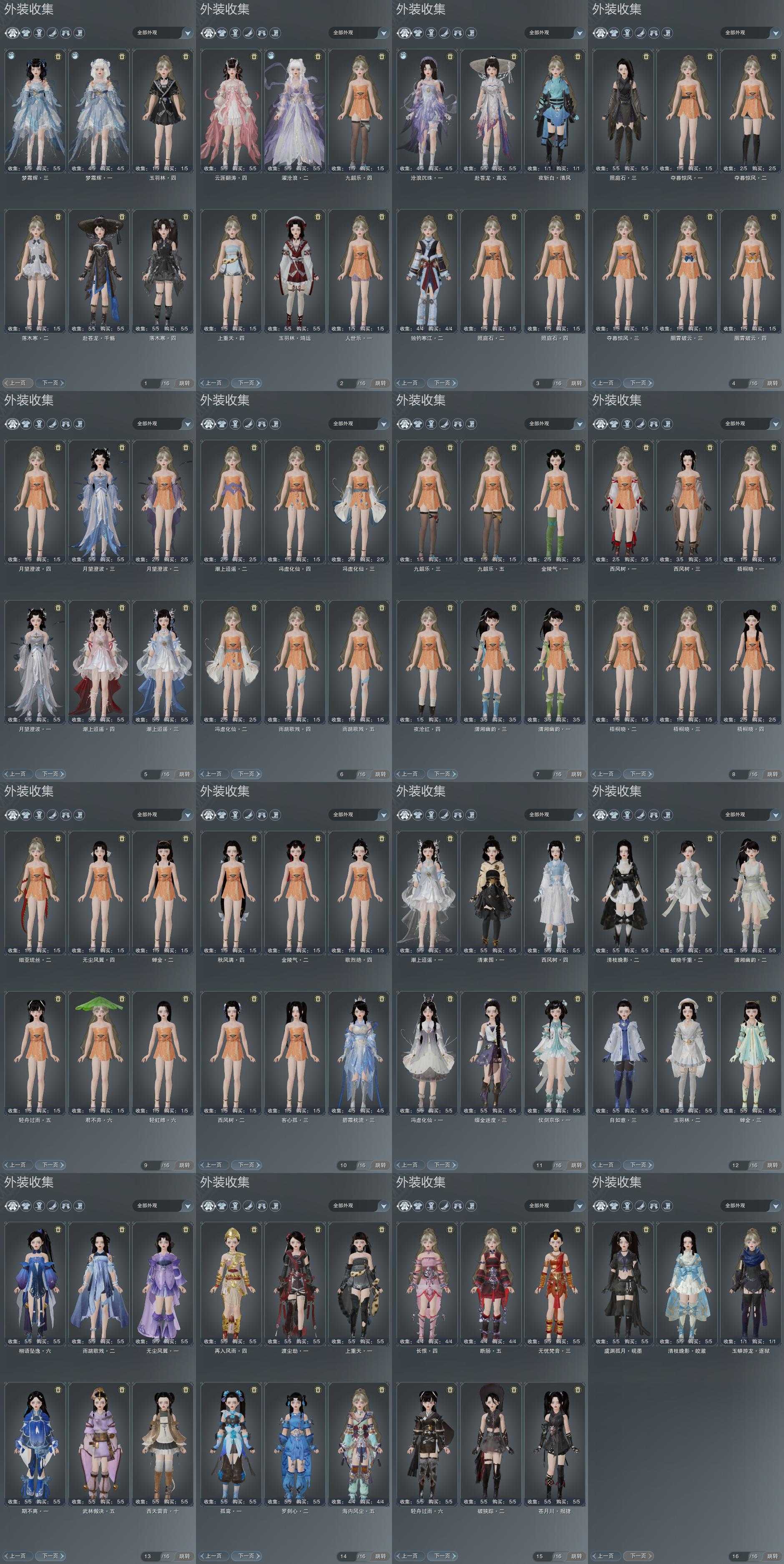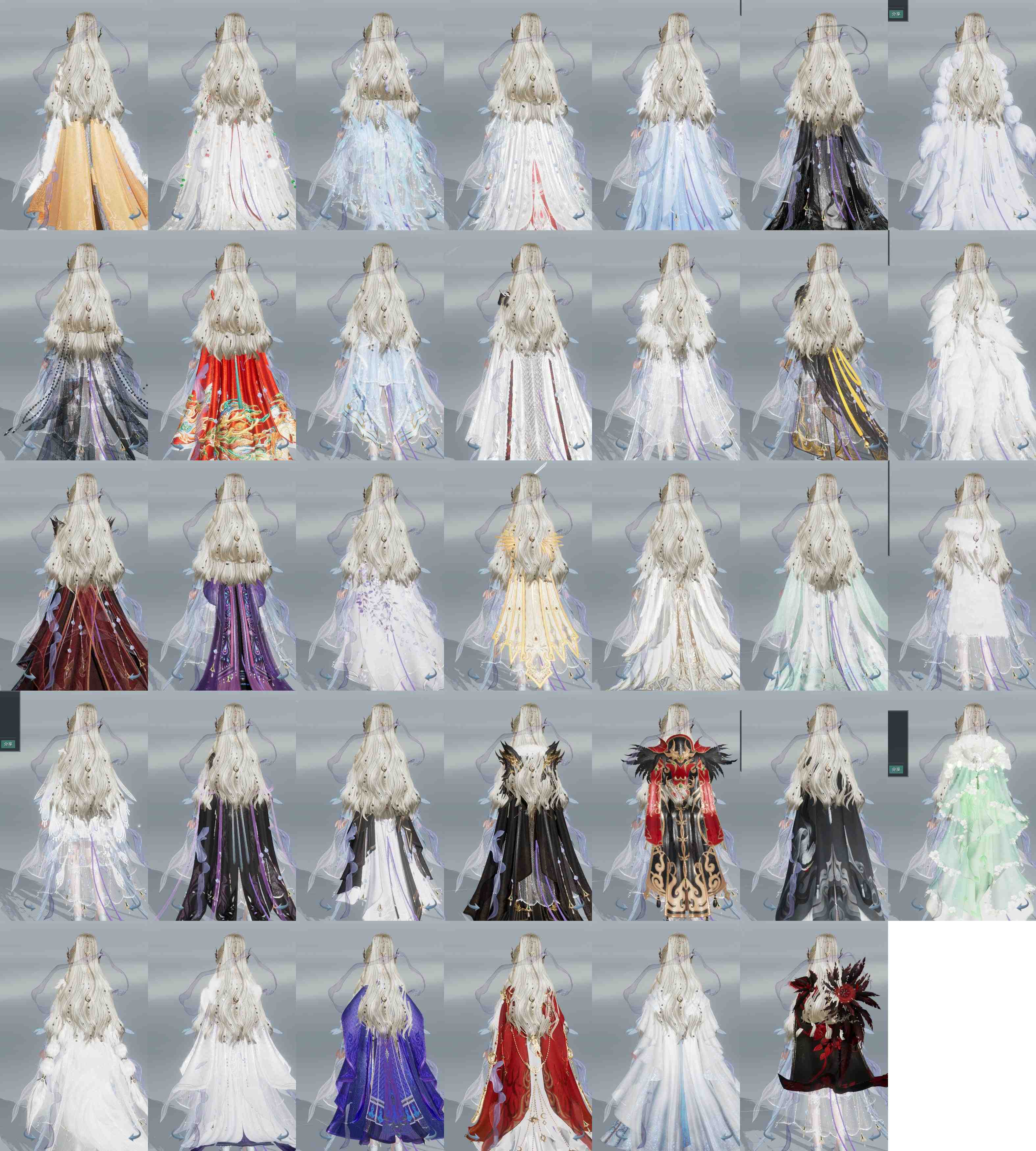 限时限量:[明镜高悬, 富婆套, 打歌服, 点春晴, 雪衣寒月, 十三万资历衣, 十六万资历衣, 侠影空山, 冷霜霏微, 中宵渊霜, 容与自适, 黄长安, 镜湖云遥, 镜湖阑珊, 琴台顾素手, 点寒星沉玉, 玉悬窗棠语, 客行逍遥夜影, 小红龙衣, 盈露鹤清, 流夜辉墨, 一期福袋成衣, 黄泳衣, 蓝水母, 清商风饮流萦, 万川青绿石琅, 蓝浪海, 浮光绡, 蓝碧海, 黑碧海, 蓝游仙]