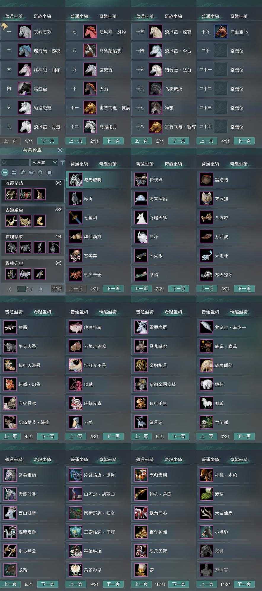 【坐骑】19个[乌蹄抱月, 维骐, 雪马, 黑翅马, 踏竹骠坚白, 络神骏胭扣, 浪风燕今古, 瀛海驹游夜, 霸红尘, 雷首飞电惊辰, 雷首飞电驰辉, 乌鬃踏焰驹]
