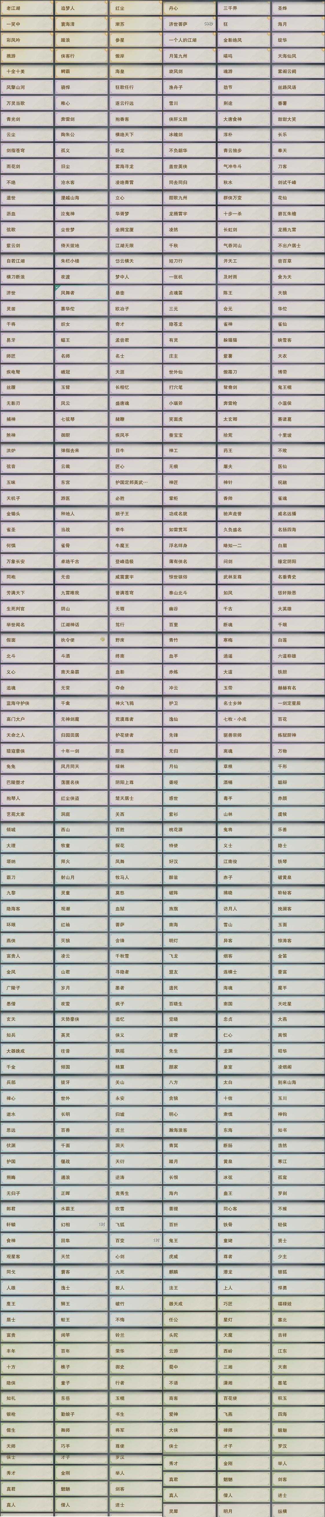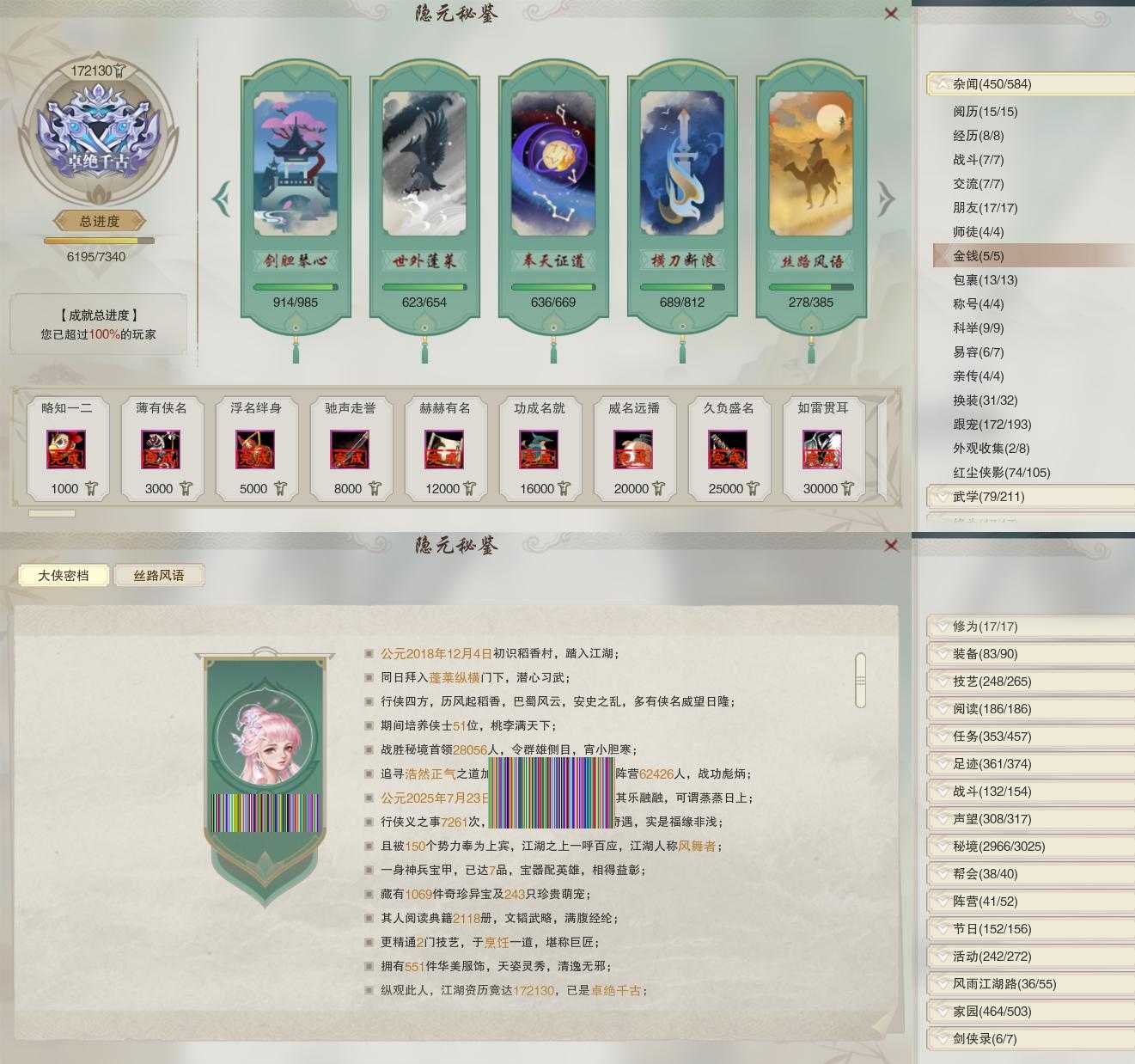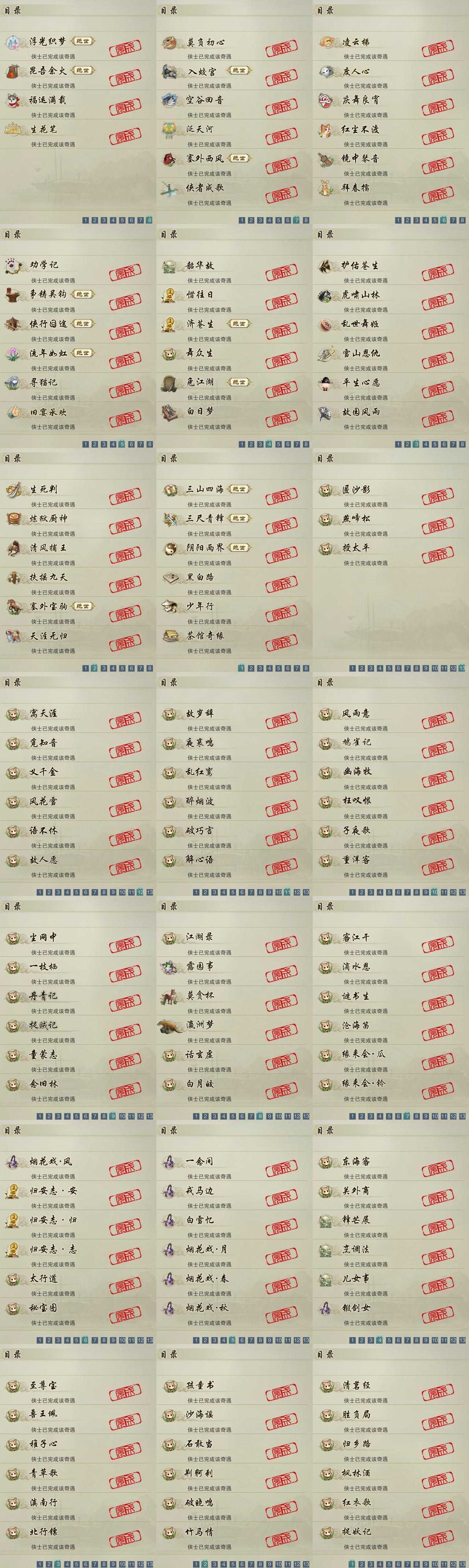 【奇遇】46个[白日梦, 天涯无归, 三山四海, 劝学记, 雪山恩仇, 阴阳两界, 莫负初心, 兔江湖, 平生心愿, 黑白路, 惜往日, 乱世舞姬, 塞外宝驹, 争铸吴钩, 韶华故, 虎啸山林, 济苍生, 护佑苍生, 少年行, 故园风雨, 扶摇九天, 三尺青锋, 流年如虹, 舞众生, 清风捕王, 侠行囧途, 寻猫记, 茶馆奇缘, 入蛟宫, 庆舞良宵]